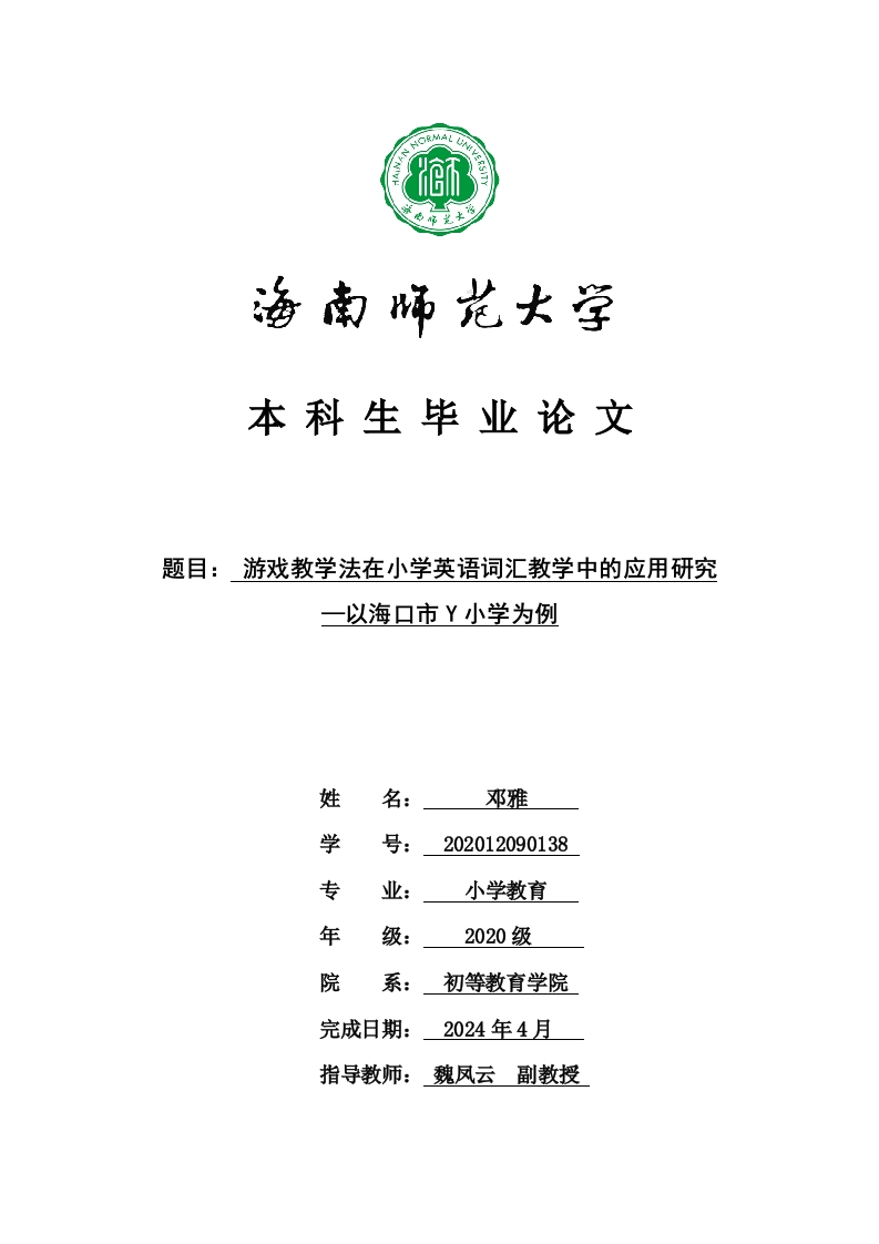 本科生毕业论文题目:游戏教学法在小学英语词汇教学中的应用研究一以海口市Y小学为例姓名:邓雅学号:202012090138专小学教育年级:2020级院初等教育学院完成日期:2024年4月指导教师:魏凤云副教授本科生毕业论文(设计)独创性声明本人声明所呈交的毕业论文(设计)是本人在导师指导下进行的研究工作及取得的研究成果,除了文中特别加以标注和致谢的地方外,本论文中没有抄袭他人研究成果和伪造数据等行为。与我一同工作的同志对本研究所做的任何贡献均已在论文中做了明确的说明并表示谢意。论文(设计)作者签名:日期:本科生毕业论文(设计)使用授权声明海南师范大学有权保留并向国家有关部门或机构送交毕业论文(设计)的复印件和磁盘,允许毕业论文(设计)被查阅和借阅。本人授权海南师范大学可以将本毕业论文(设计)的全部或部分内容编入有关数据库进行检索,可以采用影印、缩印或其他复印手段保存、汇编毕业论文(设计)。论文(设计)作者签名:日期:指导教师签名:日期:游戏教学法在小学英语词汇教学中的应用研究一以海口市Y小学为例作者:邓雅指导教师:魏凤云副教授(海南师范大学初等教育学院,海南海口,571158)摘要:游戏教学法是根据学生好奇心旺盛,活泼好动等身心特点和发展规律,将学生们感兴趣的游戏和教学内容相结合,使得小学生能够在愉悦的氛围中快乐地学习知识,真正实现寓教于乐。本文以海口市Y小学为调查对象,对学校内的英语教师进行访谈,并对一年级和三年级的四个班进行课堂观察,以此来了解校内对游戏教学法的应用现状。首先,本文从访谈和课堂观察的基础上分析了游戏教学法在小学英语词汇教学中的应用所存在的问题,即教师对游戏教学法的认识不足、教师运用的游戏类型缺乏创新、教师对游戏规则讲解不清晰、游戏资源匮乏限制教师使用游戏教学法等。其次,基于以上问题,笔者提出了树立终身学习理念,提高学科专业素养:从教材出发,创设词汇学习情境:简化规则语言,及时反馈调整;合理地开发游戏教学资源等策略从而优化游戏教学法,以期望为改进教学方法,提高词汇学习效率提供有益建议。关键词:游戏教学法词汇教学小学英语Study on the Application of Game Teaching Method toEnglish Vocabulary Teaching in Primary Schools-Taking Haikou Y Primary School as an ExampleAuthor:Deng Ya Supervisor:Associate Professor Wei Fengyun(College of Elementary Education,Hainan Normal University,Haikou,Hainan,571158)Abstract:The game teaching method is based on the physical and mental characteristics anddevelopmental rules of students,and combines the games that students are interested in with theteaching content,so that primary school students can acquire knowledge happily in an enjoyableatmosphere.This study takes Y Primary School in Haikou City as the object of investigation,andconducts interviews with English teachers in the school,and carries out the classroom observationon four classes of Grade 1 and Grade 3,so as to understand the current status of the application ofthe game teaching method in the school.Firstly,this paper analyses the problems that exist in theapplication of game teaching method in primary English vocabulary teaching on the basis ofinterviews and classroom observations,teachers'insufficient knowledge of game teaching method,teachers'lack of innovation in the types of games,teachers'unclear explanation of game rules,andthe lack of game resources that limit teachers'use of game teaching method.Secondly,based onthe above problems,strategies such as establishing the concept of lifelong learning and improvingprofessionalism in the subject,starting from the textbook,create vocabulary learning situation,