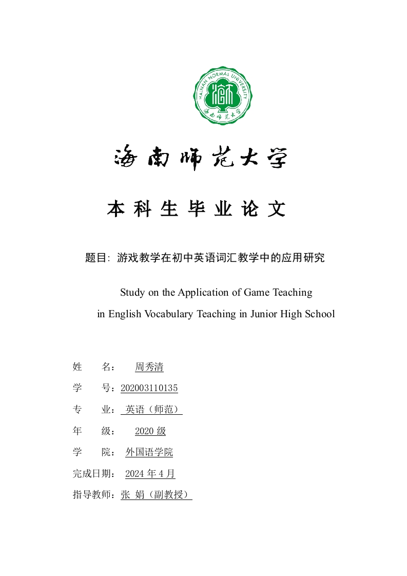 本科生毕业论文题目:游戏教学在初中英语词汇教学中的应用研究Study on the Application of Game Teachingin English Vocabulary Teaching in Junior High School姓名:周秀清学号:202003110135专业:英语(师范)年级:2020级学外国语学院完成日期:2024年4月指导教师:张娟(副教授)Study on the application of GameTeachingin English Vocabulary Teachingin Junior High SchoolA Thesis Submittedto Faculty of School of Foreign Languages,Hainan Normal Universityin Partial Fulfillment of the Requirementsfor the Degree of Bachelor of ArtsBy Zhou XiuqingSupervisor:Zhang Juan (Associate Professor)April,2024本科生毕业论文独创性声明本人声明所呈交的毕业论文是本人在导师指导下进行的研究工作及取得的研究成果,除了文中特别加以标注和致谢的地方外,本论文中没有抄袭他人研究成果和伪造数据等行为。与我一同工作的同志对本研究所做的任何贡献均已在论文中作了明确的说明并表示谢意。论文作者签名:日期:2023年4月17日本科生毕业论文使用授权声明海南师范大学有权保留并向国家有关部门或机构送交毕业论文的复印件和磁盘,允许毕业论文被查阅和借阅。本人授权海南师范大学可以将本毕业论文的全部或部分内容编入有关数据库进行检索,可以采用影印、缩印或其他复印手段保存、汇编毕业论文。论文作者签名:日期:2023年4月17日指导教师签名:日期:2023年4月17日