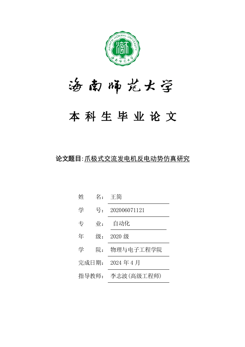 本科生毕业论文论文题目:爪极式交流发电机反电动势仿真研究姓名:王简学号:202006071121专业:自动化年级:2020级学院:物理与电子工程学院完成日期:2024年4月指导教师:李志波(高级工程师)本科生毕业论文独创性声明本人声明所呈交的毕业论文是本人在导师指导下进行的研究工作及取得的研究成果,除了文中特别加以标注和致谢的地方外,本论文中没有抄袭他人研究成果和伪造数据等行为。与我一同工作的同志对本研究所做的任何贡献均已在论文中作了明确的说明并表示谢意。论文作者签名:日期:20年月日本科生毕业论文使用授权声明海南师范大学有权保留并向国家有关部门或机构送交毕业论文的复印件和磁盘,允许毕业论文被查阅和借阅。本人授权海南师范大学可以将本毕业论文的全部或部分内容编入有关数据库进行检索,可以采用影印、缩印或其他复印手段保存、汇编毕业论文。论文作者签名:日期:20年月日指导教师签名:日期:20年月日目录1引言.1.1研究背景与意义...11.2国外爪极电机研究现状...2352.1电励磁无刷爪极发电机结构682.4本章小结.10103.2电励磁爪极交流发电机模型建立.·3.2.1电励磁爪极发电机边界条件...113.3电励磁爪极交流发电机反电动势计算.....3.3.2电励磁爪极交流发电机空载反电动势仿真研究...172323参考文献:24