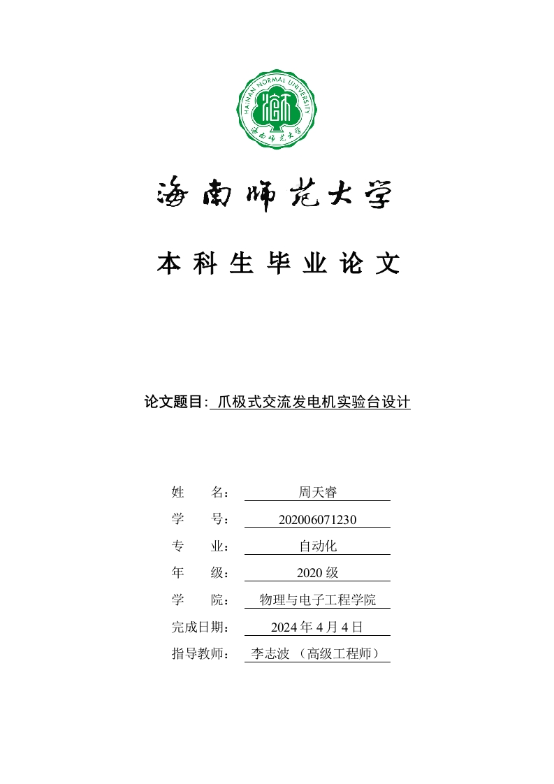 本科生毕业论文论文题目:爪极式交流发电机实验台设计姓名:周天睿学号:202006071230专业:自动化年级:2020级学院:物理与电子工程学院完成日期:2024年4月4日指导教师:李志波(高级工程师)本科生毕业论文独创性声明本人声明所呈交的毕业论文是本人在导师指导下进行的研究工作及取得的研究成果,除了文中特别加以标注和致谢的地方外,本论文中没有抄袭他人研究成果和伪造数据等行为。与我一同工作的同志对本研究所做的任何贡献均已在论文中作了明确的说明并表示谢意。论文作者签名:日期:20年月日本科生毕业论文使用授权声明海南师范大学有权保留并向国家有关部门或机构送交毕业论文的复印件和磁盘,允许毕业论文被查阅和借阅。本人授权海南师范大学可以将本毕业论文的全部或部分内容编入有关数据库进行检索,可以采用影印、缩印或其他复印手段保存、汇编毕业论文。论文作者签名:日期:20年月日指导教师签名:日期:20年月日目录11.2国内外研究现状...1.2.1国内研究现状.....1.2.2国外研究现状....22发电机实验台的设计及实现....2.1实验的设计的目标....22.21控制方式的选择...22.22电机以及变频器的选择...........22.23电源和电线的选择....42.24连接方式的选择....42.25测量仪器的选择.·52.26实验台组成和连接的设想...562.31实验台的主体部分..62.32测量元件部分.....3实验过程以及数据处理与分析.·+++++73.11明确试验方案...73.12实验步骤...