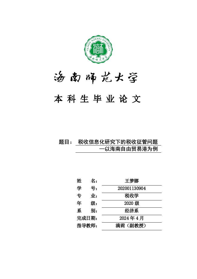 本科生毕业论文题目:税收信息化研究下的税收征管问题一以海南自由贸易港为例名:王梦娜姓学专年号:202001130904税收学2020级系经济系完成日期:2024年4月指导教师:满莉(副教授)本科生毕业论文(设计)独创性声明本人声明所呈交的毕业论文(设计)是本人在导师指导下进行的研究工作及取得的研究成果,除了文中特别加以标注和致谢的地方外,本论文中没有抄袭他人研究成果和伪造数据等行为。与我一同工作的同志对本研究所做的任何贡献均已在论文中作了明确的说明并表示谢意。论文(设计)作者签名:王梦娜日期:2024年4月9日本科生毕业论文(设计)使用授权声明海南师范大学有权保留并向国家有关部门或机构送交毕业论文(设计)的复印件和磁盘,允许毕业论文(设计)被查阅和借阅。本人授权海南师范大学可以将本毕业论文(设计)的全部或部分内容编入有关数据库进行检索,可以采用影印、缩印或其他复印手段保存、汇编毕业论文(设计)。论文(设计)作者签名:王梦娜2024年4月9日指导教师签名:满莉日期:2024年4月9日目录Abstract:一、绪论2(一)研究背景…2(二)文献综述.21.国内研究现状22.国外研究现状3(四)研究方法1.文献研究法2.实证分析法(伍)研究内容二、税收信息化建设…(一)税收信息化概述1税收信息化定义52.税收信息化的发展历程和现状3.税收信息化的特征…64.税收信息化技术的应用5.面临的问题…6税收信息化的意义.…7(二)税收信息化与数字经济…1.数字经济的概念2.数字经济发展现状.…74.信总化与数字经济的联系和区别8(三)税收信息化对税收征管的影响1.正面影响.82.反面影响.…9三、海南自由贸易港税收信息化发展的分析(一)海南自由贸易港概况…9(二)海南自由贸易港税收信息化现状101.信息化基础设施建设2.积极推行信息化手段103.税收服务信息化104.信息安全管理…10(三)信息化技术在海南省税收征管中的具体应用案例(四)海南自由贸易港信息化发展下的优势112.技术优势123.数据优势…12(五)海南自由贸易港信息化发展下的不足.121.信息化应用水平不高.12