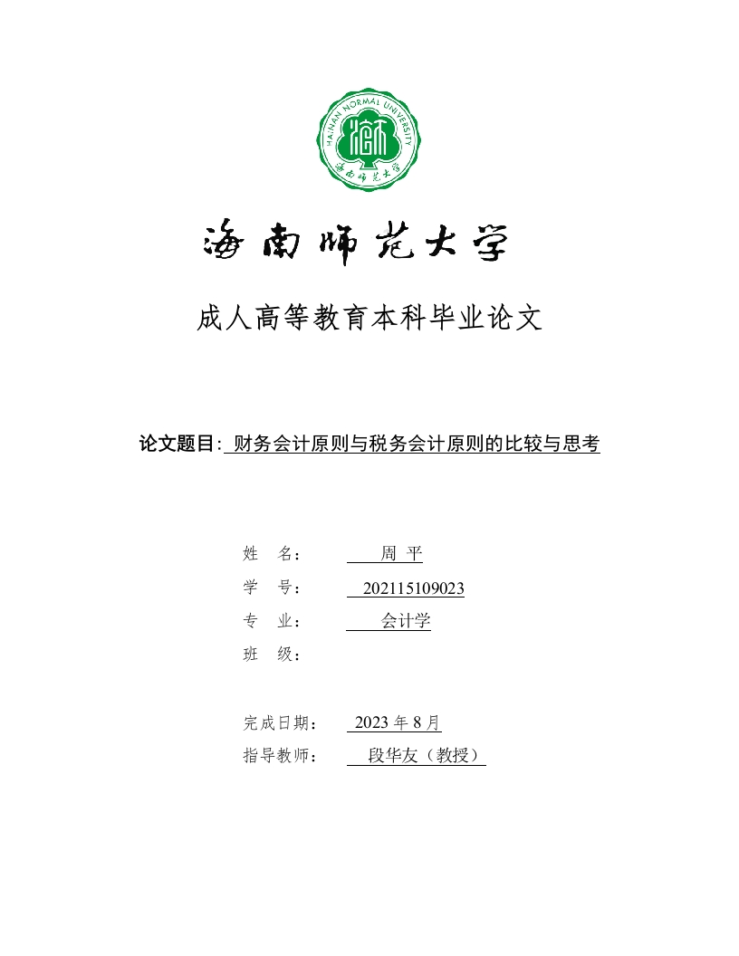 成人高等教育本科毕业论文论文题目:财务会计原则与税务会计原则的比较与思考姓名:周平学号:202115109023专业:会计学班级:完成日期:2023年8月指导教师:段华友(教授)本科生毕业论文独创性声明本人声明所呈交的毕业论文是本人在导师指导下进行的研究工作及取得的研究成果,除了文中特别加以标注和致谢的地方外,本论文中没有抄袭他人研究成果和伪造数据等行为。与我一同工作的同志对本研究所做的任何贡献均已在论文中作了明确的说明并表示谢意。论文作者签名:周平日期:2023年8月26日本科生毕业论文使用授权声明海南师范大学有权保留并向国家有关部门或机构送交毕业论文的复印件和磁盘,允许毕业论文被查阅和借阅。本人授权海南师范大学可以将本毕业论文的全部或部分内容编入有关数据库进行检索,可以采用影印、缩印或其他复印手段保存、汇编毕业论文。论文作者签名:周平日期:2023年8月25旦指导教师签名:段华友日期:20年月日摘要在当前经济全球化背景下,财务会计和税务会计作为两个重要的会计领域,其原则的比较与思考成为一个热门研究方向。本文旨在比较财务会计原则与税务会计原则的异同,并对其背后的思考进行探讨,以期加深对两者之间关系的理解。通过综合分析相关文献和法规,对财务会计原则和税务会计原则进行了系统的概述和归纳,并对两者在会计处理、报表内容和税务优惠等方面进行了比较研究。通过比较研究,发现财务会计原则和税务会计原则存在一定的异同之处。财务会计更注重信息披露的质量和透明度,而税务会计则更关注税收的计算和规避。在税务筹划和企业资产负债表管理方面,两者存在一定的冲突和利益博弈。因此,加强财务会计与税务会计的协调与整合,将有助于提升企业会计规范性和税务合规性。本研究为财务会计与税务会计的研究提供了一定的理论依据和实践参考。未来,我们可以深入挖掘两者之间的关系,提出更多合理的制度安排和政策建议,进一步推进财务会计与税务会计的协调发展,为企业和经济的可持续发展做出贡献。以上简要概述了本论文的研究背景、研究目的/意义、研究方法过程、研究结果/结论以及总结展望等内容。通过比较财务会计原则与税务会计原则的异同,本文对两者关系的思考提供了一定的启示和建议,为相关研究和实践提供了有益的参考。关键词:财务会计原则:税务会计原则:比较:思考