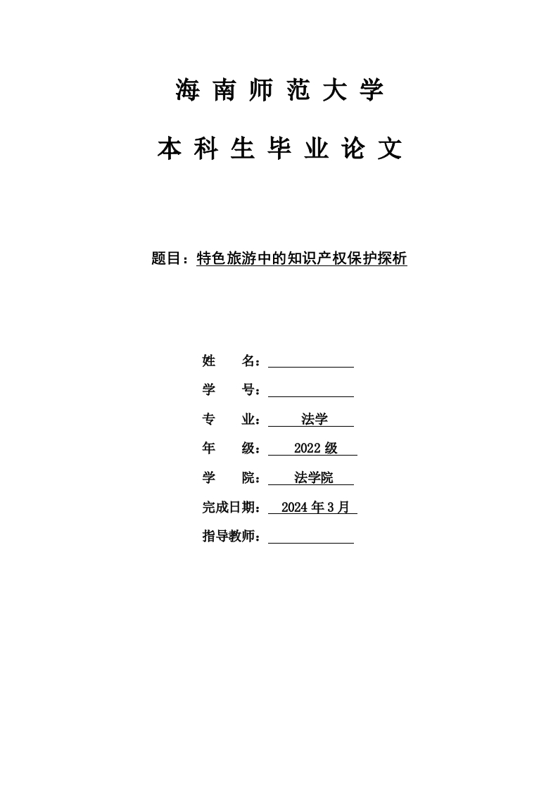 海南师范大学本科生毕业论文题目:特色旅游中的知识产权保护探析姓名:学号:专法学年级:2022级学法学院完成日期:2024年3月指导教师:本科生毕业论文(设计)独创性声明本人声明所呈交的毕业论文(设计)是本人在导师指导下进行的研究工作及取得的研究成果,除了文中特别加以标注和致谢的地方外,本论文中没有抄袭他人研究成果和伪造数据等行为。与我一同工作的同志对本研究所做的任何贡献均已在论文中作了明确的说明并表示谢意。论文(设计)作者签名:日期:本科生毕业论文(设计)使用授权声明海南师范大学有权保留并向国家有关部门或机构送交毕业论文(设计)的复印件和磁盘,允许毕业论文(设计)被查阅和借阅。本人授权海南师范大学可以将本毕业论文(设计)的全部或部分内容编入有关数据库进行检索,可以采用影印、缩印或其他复印手段保存、汇编毕业论文(设计)。论文(设计)作者签名:日期:指导教师签名:日期:目录目Abstract:.....一、特色旅游中的知识产权保护概述..…11(二)特色旅游中的知识产权保护问题21.特色旅游中的知识产权表现形态22、特色旅游中的知识产权保护特点...二、海南特色旅游中的知识产权保护现状、问题及原因(一)海南特色旅游中的知识产权保护现状31.海南特色旅游中的知识产权表现形态32.海南特色旅游中的知识产权保护现状4(二)海南特色旅游中的知识产权保护问题....61.立法问题…663.其他问题7(三)海南特色旅游中知识产权保护问题的原因分析...·71.立法上不重视.72.行政执法与司法不到位……三、国内其他地区特色旅游知识产权保护的经验及借鉴.9(一)国内其他地区特色旅游知识产权保护的经验.·9(二)国内其他地区特色旅游知识产权保护的借鉴10四、海南特色旅游知识产权保护的完普措施.·1111(二)执法与司法完善11(三)其他举措12结语131415