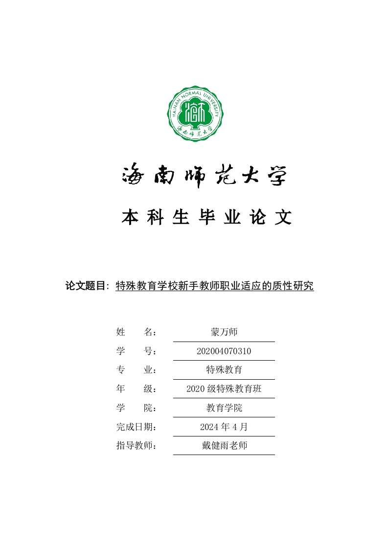 本科生毕业论文论文题目:特殊教育学校新手教师职业适应的质性研究姓名:蒙万师学202004070310专业:特殊教育年级:2020级特殊教育班学院:教育学院完成日期:2024年4月指导教师:戴健雨老师本科生毕业论文独创性声明本人声明所呈交的毕业论文是本人在导师指导下进行的研究工作及取得的研究成果,除了文中特别加以标注和致谢的地方外,本论文中没有抄袭他人研究成果和伪造数据等行为。与我一同工作的同志对本研究所做的任何贡献均已在论文中作了明确的说明并表示谢意。论文作者签名:日期:20本科生毕业论文使用授权声明海南师范大学有权保留并向国家有关部门或机构送交毕业论文的复印件和磁盘,允许毕业论文被查阅和借阅。本人授权海南师范大学可以将本毕业论文的全部或部分内容编入有关数据库进行检索,可以采用影印、缩印或其他复印手段保存、汇编毕业论文。论文作者签名:日期:20年月日指导教师签名:日期:20年月日