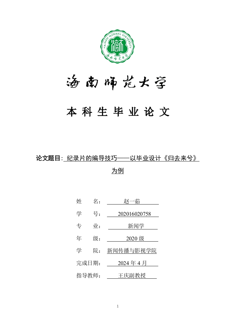 本科生毕业论文论文题目:纪录片的编导技巧一以毕业设计《归去来兮》为例姓名:赵一茹学号:202016020758专业:新闻学年级:2020级学院:新闻传播与影视学院完成日期:2024年4月指导教师:王庆副教授1本科生毕业论文独创性声明本人声明所呈交的毕业论文是本人在导师指导下进行的研究工作及取得的研究成果,除了文中特别加以标注和致谢的地方外,本论文中没有抄袭他人研究成果和伪造数据等行为。与我一同工作的同志对本研究所做的任何贡献均已在论文中作了明确的说明并表示谢意。论文作者签名:日期:20年月日本科生毕业论文使用授权声明海南师范大学有权保留并向国家有关部门或机构送交毕业论文的复印件和磁盘,允许毕业论文被查阅和借阅。本人授权海南师范大学可以将本毕业论文的全部或部分内容编入有关数据库进行检索,可以采用影印、缩印或其他复印手段保存、汇编毕业论文。论文作者签名:日期:20年月日指导教师签名:日期:20年月日2目录(一)导演阐述1二、研究现状.22(二)乡村教育类纪录片现状....三、《归去来兮》编导叙事结构的创作策略...(一)线性叙事方式:展示乡村教育发展样态.·4(二)多线交叉的叙事结构:串联人物关系和情节四、《归去来兮》编导语言的运用技巧..··5(一)长镜头加强沉浸感..·5(二)6(三)群像化叙事增强情感认同.……6(四)素材选择突出主题表达.…6五、结语8883