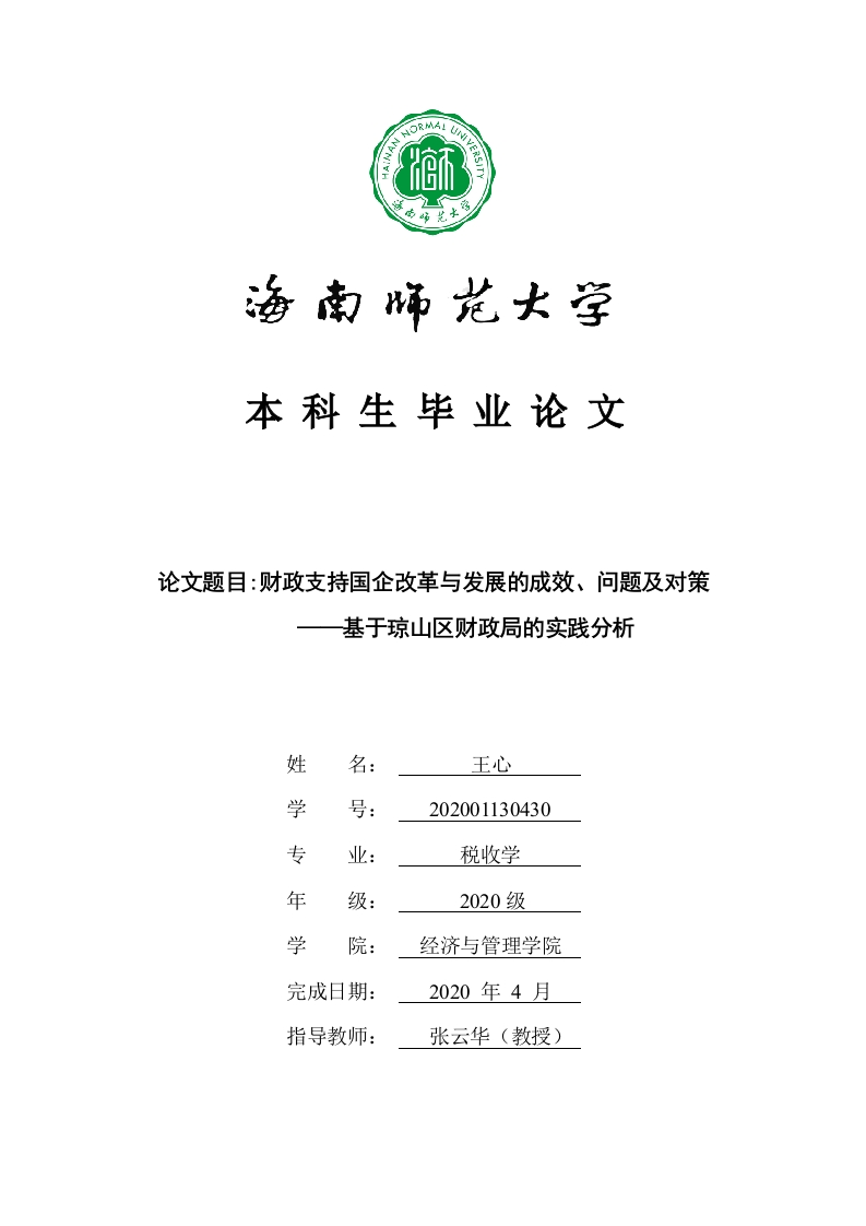 本科生毕业论文论文题目:财政支持国企改革与发展的成效、问题及对策—基于琼山区财政局的实践分析姓名:王心学号:202001130430专业:税收学年级:2020级学院:经济与管理学院完成日期:2020年4月指导教师:张云华(教授)本科生毕业论文独创性声明本人声明所呈交的毕业论文是本人在导师指导下进行的研究工作及取得的研究成果,除了文中特别加以标注和致谢的地方外,本论文中没有抄袭他人研究成果和伪造数据等行为。与我一同工作的同志对本研究所做的任何贡献均已在论文中作了明确的说明并表示谢意。论文作者签名:王心日期:2020年4月17日本科生毕业论文使用授权声明海南师范大学有权保留并向国家有关部门或机构送交毕业论文的复印件和磁盘,允许毕业论文被查阅和借阅。本人授权海南师范大学可以将本毕业论文的全部或部分内容编入有关数据库进行检索,可以采用影印、缩印或其他复印手段保存、汇编毕业论文。论文作者签名:王心日期:2020年4月17日指导教师签名:日期:20年月日目录一、财政支持国企改革的必要性与重要性分析(一)国有企业的一般性特点(二)财政支持国企改革的理论逻辑1.财政职能理论2.公共收入理论3.科斯产权理论(三)财政支持国企改革的现实需要与经济逻辑(四)从国家财税角度分析国企改革1.国家财税政策改革对国企发展的作用2.国家财税政策改革支持国企发展的措施(五)我国财政支持国企改革的历史梳理及评价二、新时代下财政支持国有企业改革(一)我国国有企业改革的国内外环境(二)“十四五”国有改革新要求(三)“十四五”国企改革新方向