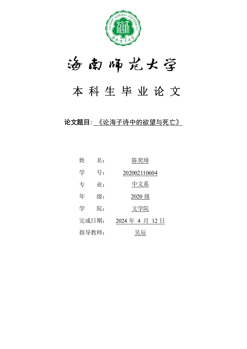本科生毕业论文论文题目:《论海子诗中的欲望与死亡》姓名:陈奕璋学号:202002110604专业:中文系年2020级学文学院完成日期:2024年4月12日指导教师:吴辰本科生毕业论文(设计)独创性声明本人声明所呈交的毕业论文(设计)是本人在导师指导下进行的研究工作及取得的研究成果,除了文中特别加以标注和致谢的地方外,本论文中没有抄袭他人研究成果和伪造数据等行为。与我一同工作的同志对本研究所做的任何贡献均已在论文中作了明确的说明并表示谢意。论文作者签名:日期:20年月日本科生毕业论文(设计)使用授权声明海南师范大学有权保留并向国家有关部门或机构送交毕业论文(设计)的复印件和磁盘,允许毕业论文(设计)被查阅和借阅。本人授权海南师范大学可以将本毕业论文(设计)的全部或部分内容编入有关数据库进行检索,可以采用影印、缩印或其他复印手段保存、汇编毕业论文(设计)。论文作者签名:日期:20年月日指导教师签名:日期:20年月日目录绪论3第一章海子诗中的欲望与精神分析…3第一节个体在欲望中的纠结3第二节集体欲望的升华…第二章永恒死亡与再生.8第一节死亡与爱情-一爆炸的太阳8第二节复活与新生…第三章东方的真理12结语参考文献.15致谢…