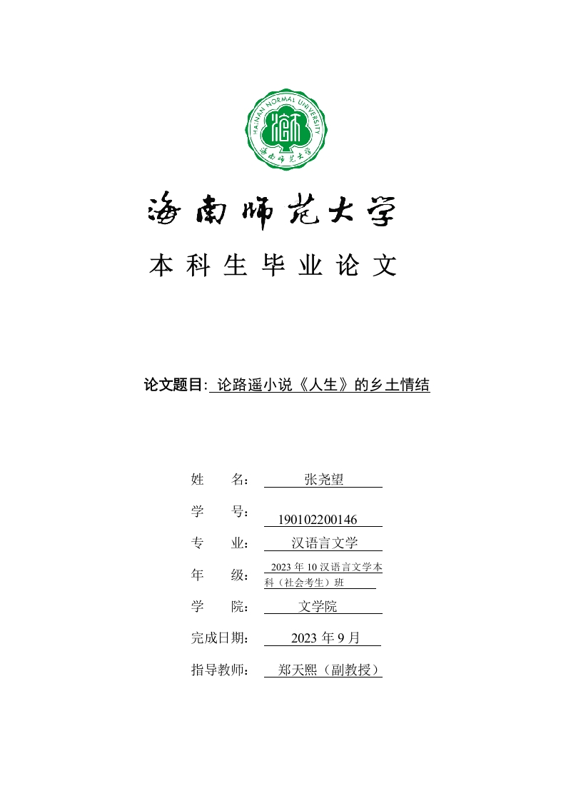本科生毕业论文论文题目:论路遥小说《人生》的乡土情结姓名:张尧望学号:190102200146专汉语言文学年级:2023年10汉语言文学本科(社会考生)班学院:文学院完成日期:2023年9月指导教师:郑天熙(副教授)本科生毕业论文独创性声明本人声明所呈交的毕业论文是本人在导师指导下进行的研究工作及取得的研究成果,除了文中特别加以标注和致谢的地方外,本论文中没有抄袭他人研究成果和伪造数据等行为。与我一同工作的同志对本研究所做的任何贡献均已在论文中作了明确的说明并表示谢意。论文作者签名:张尧望日期:2023年9月8日本科生毕业论文使用授权声明海南师范大学有权保留并向国家有关部门或机构送交毕业论文的复印件和磁盘,允许毕业论文被查阅和借阅。本人授权海南师范大学可以将本毕业论文的全部或部分内容编入有关数据库进行检索,可以采用影印、缩印或其他复印手段保存、汇编毕业论文。论文作者签名:日期:20年月日指导教师签名:日期:20年月日目录错误!未定义书签。1路遥作品中的乡土文化特色成因探索...1.1.1成长经历..21.1.2农民之子....31.1.3农本文化...1.2作品中的乡土文化因子..1.2.1古老文化积淀...1.2.2多元文化融合...51.2.3传统文化熏陶..1.2.4开放文化的影响...72《人生》中的乡土文化的体现..2.1民俗文化的刻画.·2.1.2民俗文化体现.....92.1.3乡土人的精神文化心理探索..2.2《人生》中的陕北方言运用....。。。。。。。112.2.1作品中的方言运用....112.3.2作品中的语言特色...3《人生》中乡土情结与儒家文化结合特点..,133.1对传统价值观“仁”的尊重..