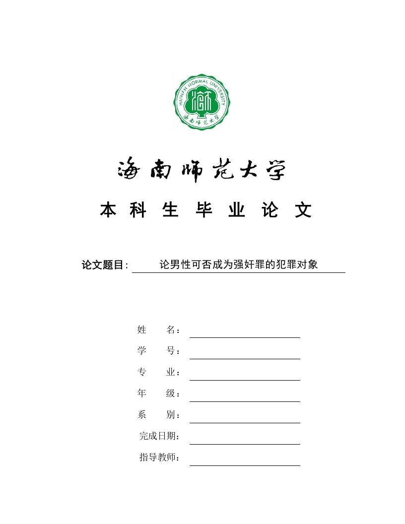 本科生毕业论文论文题目:论男性可否成为强奸罪的犯罪对象姓名:学号:专业:年系完成日期:指导教师:本科生毕业论文(设计)独创性声明本人声明所呈交的毕业论文(设计)是本人在导师指导下进行的研究工作及取得的研究成果,除了文中特别加以标注和致谢的地方外,本论文中没有抄袭他人研究成果和伪造数据等行为。与我一同工作的同志对本研究所做的任何贡献均已在论文中作了明确的说明并表示谢意。论文作者签名:日期:20年月日本科生毕业论文(设计)使用授权声明海南师范大学有权保留并向国家有关部门或机构送交毕业论文(设计)的复印件和磁盘,允许毕业论文(设计)被查阅和借阅。本人授权海南师范大学可以将本毕业论文(设计)的全部或部分内容编入有关数据库进行检索,可以采用影印、缩印或其他复印手段保存、汇编毕业论文(设计)。论文作者签名:日期:20年月日指导教师签名:日期:20年月日目录目录..摘要…Abstract.一、我国男性性权利刑法保护现状…1(一)强奸罪与强制猥亵罪的刑法保护11.强奸罪与强制猥亵罪犯罪客体与犯罪对象的认定.12.强奸罪与强制猥亵罪犯罪行为的对比分析.1(二)将男性被强奸行为纳入强制猥亵罪与强奸罪规制的对比分析…21.量刑对比.22.社会影响对比.2二、侵犯男性性权利的具体表现形式及危害.3(一)女性对男性的性侵犯…(二)同性之间的性侵犯…3(三)男性被性侵的危害.4三、域外强奸罪的男性性权利保护及我国立法缺陷4(一)德国男性性权利保护(二)日本男性性权利保护.…(三)香港男性性权利保护.5(四)我国强奸罪犯罪构成的立法缺陷51.犯罪主体角度的缺陷…52.犯罪客体的缺陷.…3.犯罪客观方面角度的缺陷.…四、男性性权利刑法保护完善.7(一)男性性权利刑法保护完善必要性71.男性遭受性侵的频发性72.男性遭受性侵于社会的危险性73.男性遭受性侵于司法的公正性8(二)强奸罪去性别化.9