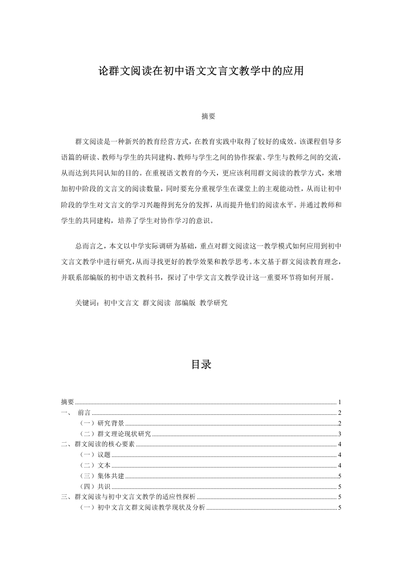 论群文阅读在初中语文文言文教学中的应用摘要群文阅读是一种新兴的教育经营方式,在教育实践中取得了较好的成效。该课程倡导多语篇的研读、教师与学生的共同建构、教师与学生之间的协作探索、学生与教师之间的交流,从而达到共同认知的目的。在重视语文教育的今天,更应该利用群文阅读的教学方式,来增加初中阶段的文言文的阅读数量,同时要充分重视学生在课堂上的主观能动性,从而让初中阶段的学生对文言文的学习兴趣得到充分的发挥,从而提升他们的阅读水平。并通过教师和学生的共同建构,培养了学生对协作学习的意识。总而言之,本文以中学实际调研为基础,重点对群文阅读这一教学模式如何应用到初中文言文教学中进行研究,从而寻找更好的教学效果和教学思考。本文基于群文阅读教育理念,并联系部编版的初中语文教科书,探讨了中学文言文教学设计这一重要环节将如何开展。关键词:初中文言文群文阅读部编版教学研究目录摘要一、前言2(二)群文理论现状研究.二、群文阅读的核心要素.4(三)集体共建55三、群文阅读与初中文言文教学的适应性探析(一)初中文言文群文阅读教学现状及分析,51.初中文言文群文阅读教学现状调查研究…2.群文阅读教学方法运用现状调查研究结果.6(二)初中文言文开展群文阅读教学的必要性及意义71.初中文言文开展群文阅读教学的必要性82.初中文言文开展群文阅读教学的意义8四、部编本教材初中文言文的群文阅读教学策略及教学实践991.文言文群文阅读教学议题的选择.92.文言文群文阅读教学的操作方式(二)教学案例:古人“劝”我要读书101.群文篇目2.文本解读3.教学目标…4、教学重难点5、教学过程6、板书设计127、作业布置…结语参考文献…12一、前言(一)研究背景尽管“群文阅读”是一种新兴的教育经营方式,但是其存在的理论基础却是十分充分的。其最初发端于台湾一位教授的一次讲座,并在此理念的普及与教育科研工作者的深入探讨中,逐步形成了“群文阅读”的理论。最近几年,越来越多的人开始关注阅读的教学。但是,从当前中学汉语课堂上来看,汉语阅读理解并没有得到应有的发展。群文阅读是指在一个群体中共同阅读和讨论文学作品的活动。它强调了群体的互动和共享,通过集体阅读和讨论,促进了群体成员之间的交流和思想碰撞。群文阅读的概念源于中国的文化传统,特别是古代文人雅士的读书会和文人圈子。在这些读书会中,文人们会共同阅读经典文学作品,并进行深入的讨论和交流。这种群体阅读的方式不仅有助于提高个体的文学素养和审美能力,还能够激发出更多的思考和创作灵感。随着现代社会的发展,群文阅读逐渐成为一种重要的文化活动。在学校、社区、企事业单位等各个领域,都可以组织群体阅读活动,通过共同阅读和讨论文学作品,促进群体成员之间的交流和沟通,提高文学素养和审美能力。群文阅读的好处包括:增加了对文学作品的理解和欣赏,拓宽了视野和思维方式,培养了批判性思维和创造力,促进了群体成员之间的交流和合作,提高了群体的文化素养和凝聚力。总之,群文阅读是一种集体的、互动的文学阅读活动,通过共同阅读和讨论文学作品,促进了群体成员之间的交流和思想碰撞,提高了文学素养和审美能力。群文阅读是当前汉语课堂上普遍使用的一种汉语课堂教学模式,也是当前汉语课堂上普遍存在的一种汉语课堂教学模式。因此,运用“群文阅读”这一语文课堂教学模式,对初中学生的语文阅读水平、阅读量、阅读速度等方面都具有重要意义。在此基础上,我们以“群读”为切入点,以中学语文统一教科书为依据,探讨和剖析了中学文言文的学习方式。(二)群文理论现状研究一般来说,一位教师的教学方法与授课方式在很大程度上影响着学生的听课状况和课堂质量,不同教师不同程度的知识储备和人格魅力等,都会在无形当中影响到孩子。所以,对于教师来说,文言文的教学想要改进就需要大胆尝试一些行之有效的教学方法和教学模式,