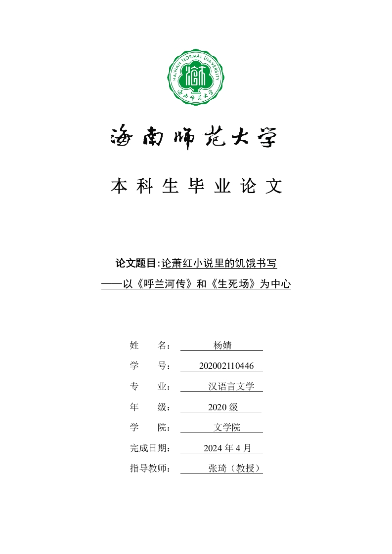 本科生毕业论文论文题目:论萧红小说里的饥饿书写—以《呼兰河传》和《生死场》为中心姓名:杨婧学号:202002110446专业:汉语言文学年级:2020级学院:文学院完成日期:2024年4月指导教师:张琦(教授)本科生毕业论文独创性声明本人声明所呈交的毕业论文是本人在导师指导下进行的研究工作及取得的研究成果,除了文中特别加以标注和致谢的地方外,本论文中没有抄袭他人研究成果和伪造数据等行为。与我一同工作的同志对本研究所做的任何贡献均已在论文中作了明确的说明并表示谢意。论文作者签名:日期:20年月日本科生毕业论文使用授权声明海南师范大学有权保留并向国家有关部门或机构送交毕业论文的复印件和磁盘,允许毕业论文被查阅和借阅。本人授权海南师范大学可以将本毕业论文的全部或部分内容编入有关数据库进行检索,可以采用影印、缩印或其他复印手段保存、汇编毕业论文。论文作者签名:日期:20年月日指导教师签名:日期:20年月日目录引言(一)选题缘由.1(二)研究现状1一、萧红小说里饥饿书写的类型2(一)饥饿书写的物质层面…3(二)饥饿书写的精神层面.…41.对抗饥饿:人类对生命的坚守与抗争42羊与泥坑:隐喻映照饥饿时代的人性畸变.…6二、萧红小说里饥饿书写的价值与意义…8(一)文学艺术价值的呈现8(二)人在饥饿状态下的生命观…9三、萧红作品里饥饿书写的动因.…10(一)“饥饿”的人生经历与作家的身份转型..10(二)写实作品的创作需要…12.14参考文献.…15致谢.16