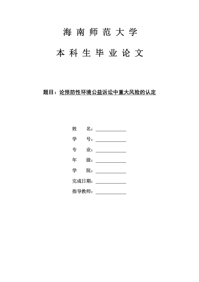 海南师范大学本科生毕业论文题目:论预防性环境公益诉讼中重大风险的认定姓名:学号:专年学完成日期:指导教师:本科生毕业论文(设计)独创性声明本人声明所呈交的毕业论文(设计)是本人在导师指导下进行的研究工作及取得的研究成果,除了文中特别加以标注和致谢的地方外,本论文中没有抄袭他人研究成果和伪造数据等行为。与我一同工作的同志对本研究所做的任何贡献均已在论文中作了明确的说明并表示谢意。论文(设计)作者签名:日期:本科生毕业论文(设计)使用授权声明海南师范大学有权保留并向国家有关部门或机构送交毕业论文(设计)的复印件和磁盘,允许毕业论文(设计)被查阅和借阅。本人授权海南师范大学可以将本毕业论文(设计)的全部或部分内容编入有关数据库进行检索,可以采用影印、缩印或其他复印手段保存、汇编毕业论文(设计)。论文(设计)作者签名:日期:指导教师签名:日期:目录目录I摘要引1一、预防性环境民事公益诉讼中“重大风险”概述.…1预防性环境民事公益诉讼的特性·11.223.22(二)预防性环境民事公益诉讼中“重大风险”的特性232.重大风险具有不确定性…34.重大风险涉及对社会公共利益的保护性..4二、预防性环境民事公益诉讼中重大风险认定的现状.·4预防性环境民事公益诉讼中重大风险认定的立法现状...·4(二)预防性环境民事公益诉讼中重大风险认定的司法现状52.6三、预防性环境民事公益诉讼中重大风险认定的问题....…7重大风险的认定规则不明…7(二)重大风险认定的主体错位.7四、预防性环境民事公益诉讼中重大风险认定的完善9(二)提高重大风险参与主体的能力…9101.建立预防性环境民事公益诉讼中重大风险的协同机制..·....1011结1213致16