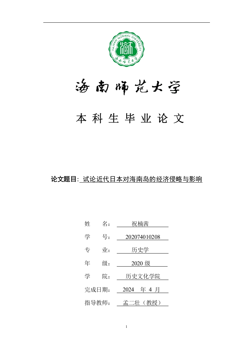 本科生毕业论文论文题目:试论近代日本对海南岛的经济侵略与影响姓名:祝楠茜学号:202074010208专业:历史学年级:2020级学历史文化学院完成日期:2024年4月指导教师:孟二壮(教授)本科生毕业论文独创性声明本人声明所呈交的毕业论文是本人在导师指导下进行的研究工作及取得的研究成果,除了文中特别加以标注和致谢的地方外,本论文中没有抄袭他人研究成果和伪造数据等行为。与我一同工作的同志对本研究所做的任何贡献均已在论文中作了明确的说明并表示谢意。论文作者签名:日期:20年月日本科生毕业论文使用授权声明海南师范大学有权保留并向国家有关部门或机构送交毕业论文的复印件和磁盘,允许毕业论文被查阅和借阅。本人授权海南师范大学可以将本毕业论文的全部或部分内容编入有关数据库进行检索,可以采用影印、缩印或其他复印手段保存、汇编毕业论文。论文作者签名:日期:20年月日指导教师签名:日期:20年月日2目录(四)重难点以及创新之处(五)研究方法.…二、日本进入海南岛前的侵略背景...(一)日本入侵之前海南岛的经济状况(二)日本入侵海南岛的基本方针..….9三、日本对海南岛的经济侵略10(一)日本对海南岛工业的侵略..(二)日本对海南岛矿业的掠夺.....12(三)日本对海南岛农业的掠夺...(四)日本对海南岛商业和贸易的侵略.·四、日本对海南岛经济侵略的特征及影响..15(一)日本对海南岛经济侵略的特征...15(二)日本对海南岛经济侵略的影响...161718