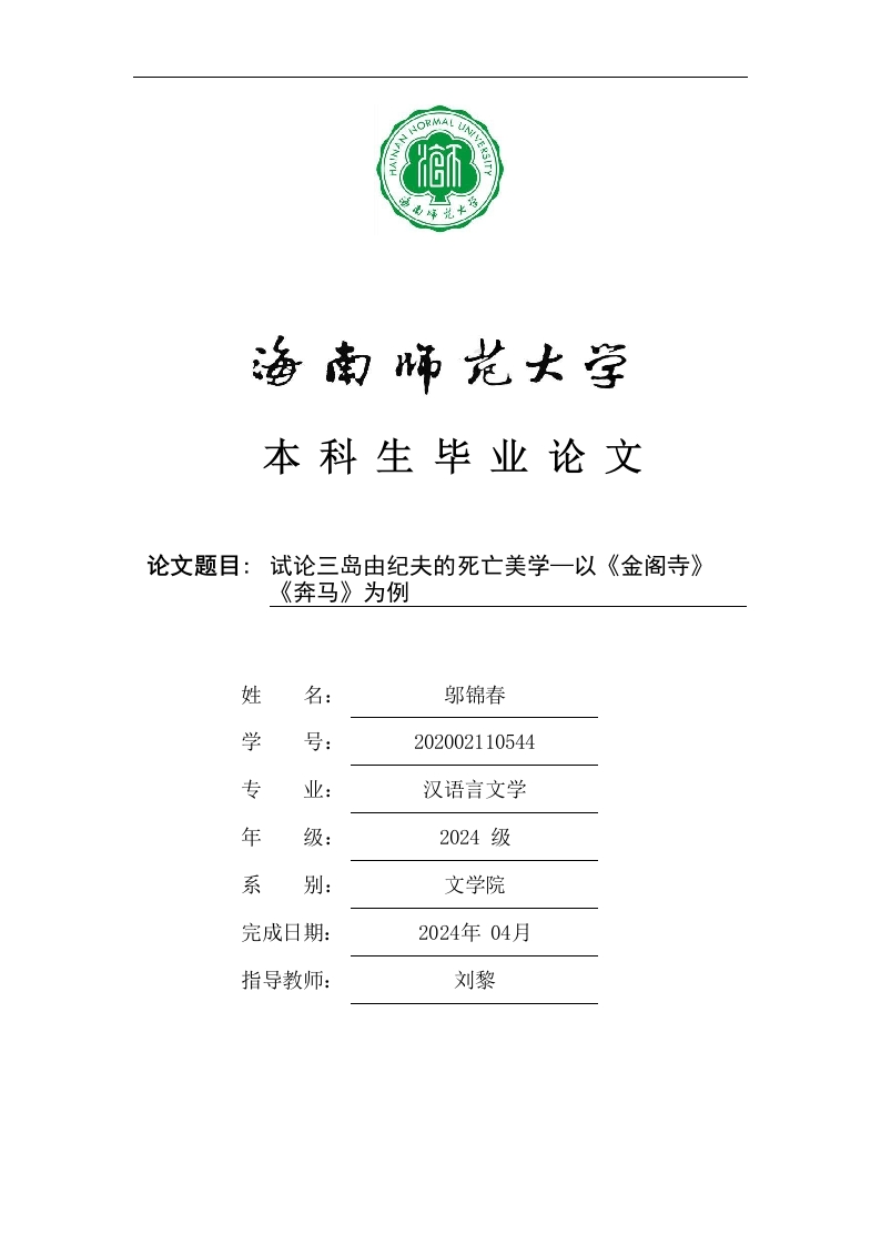 本科生毕业论文论文题目:试论三岛由纪夫的死亡美学一以《金阁寺》《奔马》为例姓名:邬锦春学号:202002110544专业:汉语言文学年2024级系文学院完成日期:2024年04月指导教师:刘黎本科生毕业论文(设计)独创性声明本人声明所呈交的毕业论文(设计)是本人在导师指导下进行的研究工作及取得的研究成果,除了文中特别加以标注和致谢的地方外,本论文中没有抄袭他人研究成果和伪造数据等行为。与我一同工作的同志对本研究所做的任何贡献均己在论文中做了明确的说明并表示谢意。论文作者签名:日期:20年月本科生毕业论文(设计)使用授权声明海南师范大学有权保留并向国家有关部门或机构送交毕业论文(设计)的复印件和磁盘,允许毕业论文(设计)被查阅和借阅。本人授权海南师范大学可以将本毕业论文(设计)的全部或部分内容编入有关数据库进行检索,可以采用影印、缩印或其他复印手段保存、汇编毕业论文(设计)。论文作者签名:日期:20年月日指导教师签名:日期:20年月日目录一、三岛由纪夫的生平及其创作(一)生平简介(二)创作概况..3343.死亡美学思想的萌芽二、《金阁寺》中的死亡美学..(一)沟口的死亡意识...(二)毁灭金阁产生美(三)死亡与性的关联..三、《奔马》中的死亡美学...77(二)三岛对生命的诠释.·7四、三岛由纪夫死亡美学的内涵与影响(一)死亡美学的主要内涵..(二)死亡美学在文学艺术中的影响,参考文献