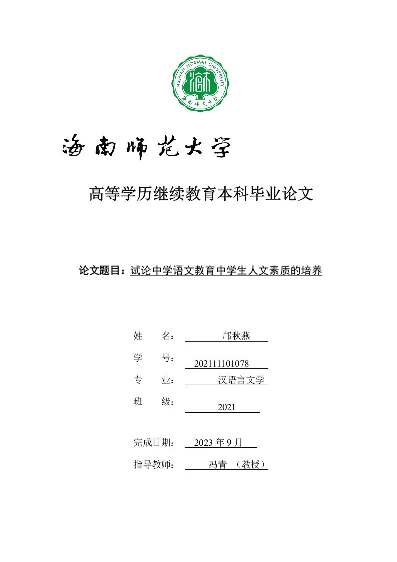 高等学历继续教育本科毕业论文论文题目:试论中学语文教育中学生人文素质的培养姓名:邝秋燕学202111101078专业:汉语言文学班级:2021完成日期:2023年9月指导教师:冯青(教授)本科生毕业论文独创性声明本人声明所呈交的毕业论文是本人在导师指导下进行的研究工作及取得的研究成果,除了文中特别加以标注和致谢的地方外,本论文中没有抄袭他人研究成果和伪造数据等行为。与我一同工作的同志对本研究所做的任何贡献均已在论文中作了明确的说明并表示谢意。论文作者签名:邝秋燕日期:2023年8月6日本科生毕业论文使用授权声明海南师范大学有权保留并向国家有关部门或机构送交毕业论文的复印件和磁盘,允许毕业论文被查阅和借阅。本人授权海南师范大学可以将本毕业论文的全部或部分内容编入有关数据库进行检索,可以采用影印、缩印或其他复印手段保存、汇编毕业论文。论文作者签名:邝秋燕日期:2023年8月6日指导教师签名:日期:20年月日目录(二)学生人文素养培养的可行性2二、中学生人文素养缺失的原因分析2(一)教育机制存在弊端.·22(三)文化活动内容单调....21.功利思想作怪..三、如何培养中学生的人文素质.3(三)构建积极良好人文环境.··2.在习作教学中培育,使学生感受人文精神的真谛....6