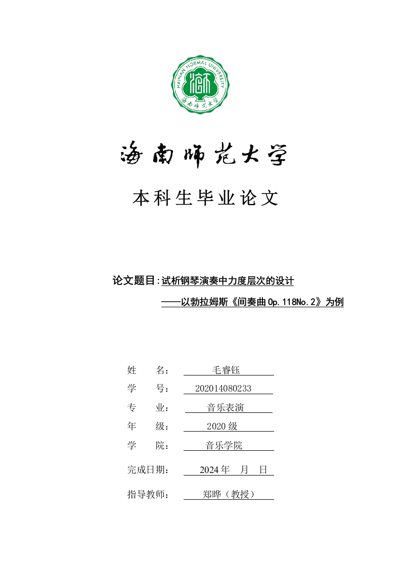 本科生毕业论文论文题目:试析钢琴演奏中力度层次的设计一以勃拉姆斯《间奏曲0p.118No.2》为例姓名:毛睿钰学号:202014080233专音乐表演年级:2020级学音乐学院完成日期:2024年月日指导教师:郑晔(教授)本科生毕业论文独创性声明本人声明所呈交的毕业论文是本人在导师指导下进行的研究工作及取得的研究成果,除了文中特别加以标注和致谢的地方外,本论文中没有抄袭他人研究成果和伪造数据等行为。与我一同工作的同志对本研究所做的任何贡献均已在论文中作了明确的说明并表示谢意。论文作者签名:日期:20年月日本科生毕业论文使用授权声明海南师范大学有权保留并向国家有关部门或机构送交毕业论文的复印件和磁盘,允许毕业论文被查阅和借阅。本人授权海南师范大学可以将本毕业论文的全部或部分内容编入有关数据库进行检索,可以采用影印、缩印或其他复印手段保存、汇编毕业论文。论文作者签名:日期:20年月日日期:20年月日目录引言…一、钢琴演奏中的力度分析…2(一)钢琴演奏中力度的基本介绍.…2(二)力度的变化类型(三)关于勃拉姆斯《间奏曲Op.118No.2》的力度基本介绍…4二、勃拉姆斯《间奏曲Op.118No.2》在音乐表现中的力度层次设计6(一)横向旋律主体的层次设计…(二)纵向多声部织体的层次设计…(三)整首作品力度层次的设计布局…10三、勃拉姆斯《间奏曲Op.118No.2》在钢琴演奏中力度层次的运用10(一)影响力度层次表现的因素.…10(二)力度层次运用中的技术重点…11(三)力度层次在勃拉姆斯《间奏曲Op.118No.2》作品中的具12结语参考文献13