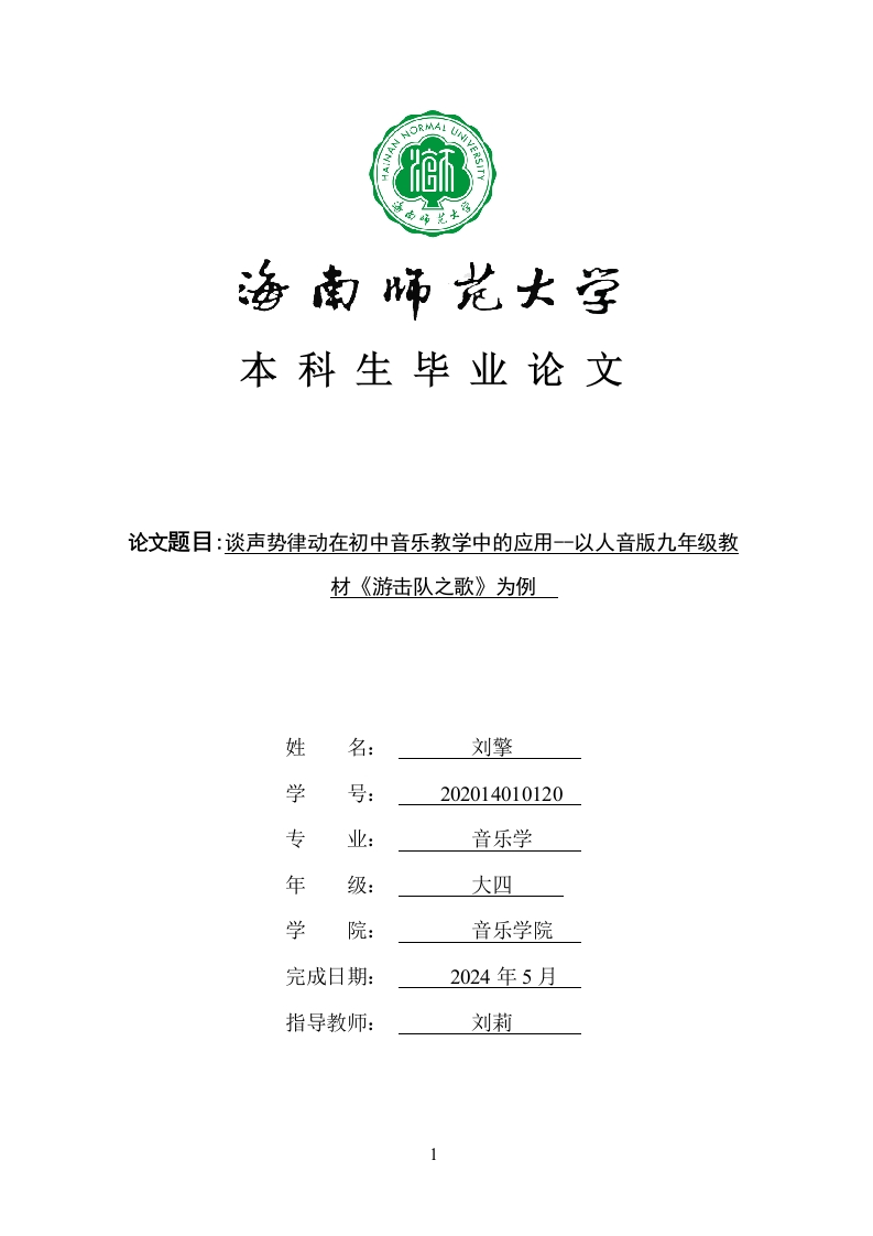 本科生毕业论文论文题目:谈声势律动在初中音乐教学中的应用一以人音版九年级教材《游击队之歌》为例姓刘擎学号:202014010120专音乐学年级:大四学院:音乐学院完成日期:2024年5月指导教师:刘莉1本科生毕业论文独创性声明本人声明所呈交的毕业论文是本人在导师指导下进行的研究工作及取得的研究成果,除了文中特别加以标注和致谢的地方外,本论文中没有抄袭他人研究成果和伪造数据等行为。与我一同工作的同志对本研究所做的任何贡献均已在论文中作了明确的说明并表示谢意。论文作者签名:日期:20年月日本科生毕业论文使用授权声明海南师范大学有权保留并向国家有关部门或机构送交毕业论文的复印件和磁盘,允许毕业论文被查阅和借阅。本人授权海南师范大学可以将本毕业论文的全部或部分内容编入有关数据库进行检索,可以采用影印、缩印或其他复印手段保存、汇编毕业论文。论文作者签名:日期:20年月日指导教师签名:日期:20年月日2目录一、引言研究背景…2(二)研究意义………二、二、声势律动教学法概述(一)声势律动的定义与特点…………3(二)声势律动教学法对学习的帮助………3(三)声势律动的重要性…三、声势律动在初中音乐教学中的应用现状…4(一)现行音乐教学模式的问题…4(二)声势律动教学法的应用分析…4(三)声势律动教学法的实践探索…4四、声势律动教学法在《游击队之歌》教学中的应用(一)教学目标与内容设计…(二)教学活动的设计与实施……6五、声势律动教学法的教学策略(一)增强学生参与度的策略…7(二)优化教学内容的策略…8(三)提升教学效果的策略…9结论…10参考文献…113