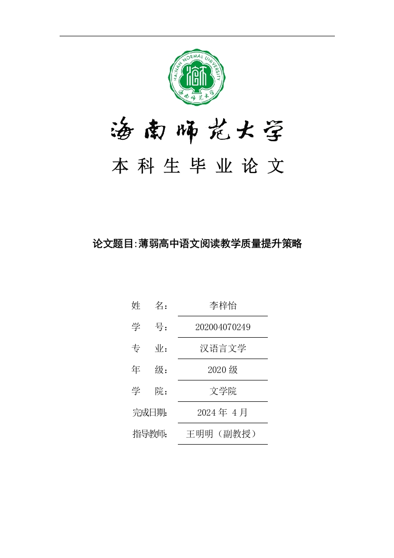 本科生毕业论文论文题目:薄弱高中语文阅读教学质量提升策略姓名:李梓怡学号:202004070249专业:汉语言文学年级:2020级学院:文学院完成日期2024年4月指导教师:王明明(副教授)本科生毕业论文独创性声明本人声明所呈交的毕业论文是本人在导师指导下进行的研究工作及取得的研究成果,除了文中特别加以标注和致谢的地方外,本论文中没有抄袭他人研究成果和伪造数据等行为。与我一同工作的同志对本研究所做的任何贡献均已在论文中作了明确的说明并表示谢意。论文作者签名:日期:年月日本科生毕业论文使用授权声明海南师范大学有权保留并向国家有关部门或机构送交毕业论文的复印件和磁盘,允许毕业论文被查阅和借阅。本人授权海南师范大学可以将本毕业论文的全部或部分内容编入有关数据库进行检索,可以采用影印、缩印或其他复印手段保存、汇编毕业论文。论文作者签名:日期:2024年月日指导教师签名:日期:2024年月日目录1.1研究背景1.2研究目的21.3研究方法21.3.1文献研究法21.3.2调查研究法31.4研究思路32.1高中语文阅读教学质量相关研究.32.2薄弱高中语文阅读教学相关研究...2.2.2.薄弱普通高中语文阅读教学有效性2.3高中语文阅读教学策略相关研究52.3.2.核心素养下的阅读教学63.2薄弱高中语文教学概述..63.3阅读教学质量问题概述.....64.2阅读现状调查及原因分析.....74.2.1关于学生阅读兴趣及阅读时间的调查…74.2.2关于学生当前面临的阅读困难的调查885.1营造阅读教学情境.…
