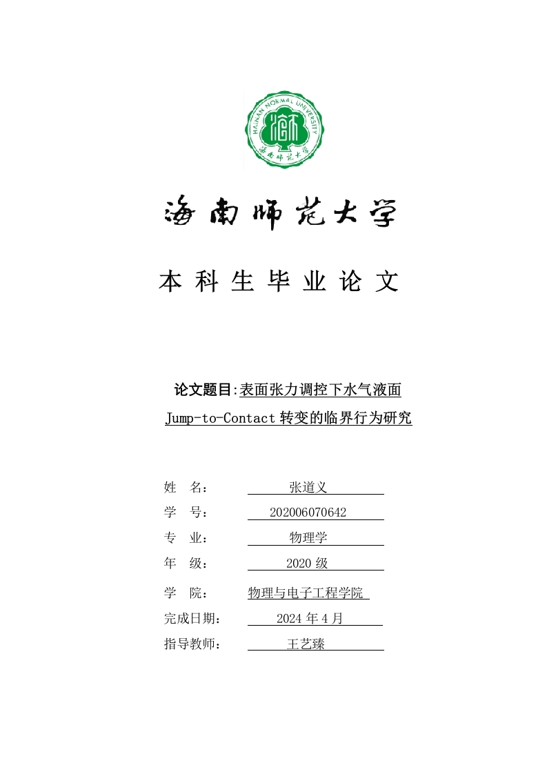 本科生毕业论文论文题目:表面张力调控下水气液面Jump-to-Contact转变的临界行为研究姓名:张道义学号:202006070642专业:物理学年级:2020级学院:物理与电子工程学院完成日期:2024年4月指导教师:王艺臻本科生毕业论文独创性声明本人声明所呈交的毕业论文是本人在导师指导下进行的研究工作及取得的研究成果,除了文中特别加以标注和致谢的地方外,本论文中没有抄袭他人研究成果和伪造数据等行为。与我一同工作的同志对本研究所做的任何贡献均已在论文中作了明确的说明并表示谢意。论文作者签名:日期:20年月日本科生毕业论文使用授权声明海南师范大学有权保留并向国家有关部门或机构送交毕业论文的复印件和磁盘,允许毕业论文被查阅和借阅。本人授权海南师范大学可以将本毕业论文的全部或部分内容编入有关数据库进行检索,可以采用影印、缩印或其他复印手段保存、汇编毕业论文。论文作者签名:日期:20年月日指导教师签名:日期:20年月日目录1.1研究意义…1.2研究成果...2.1球形固体(SS)模型2.2小球模型中的理论分析3运用的软件.++63.1 MATLAB.....4实验与实验结果分析.·4.1基于球型固体模型的范德瓦尔斯引力下液面的轮廓曲线84.2不同表面张力下液面不发生Jump-to-Contact转变小球21