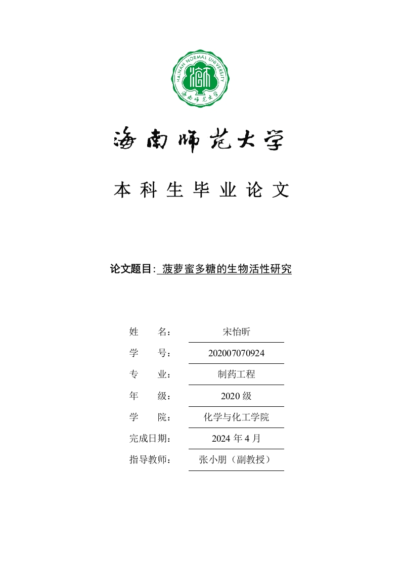 本科生毕业论文论文题目:菠萝蜜多糖的生物活性研究姓名:宋怡昕学号:202007070924专业:制药工程年级:2020级学院:化学与化工学院完成日期:2024年4月指导教师:张小朋(副教授)本科生毕业论文独创性声明本人声明所呈交的毕业论文是本人在导师指导下进行的研究工作及取得的研究成果,除了文中特别加以标注和致谢的地方外,本论文中没有抄袭他人研究成果和伪造数据等行为。与我一同工作的同志对本研究所做的任何贡献均已在论文中作了明确的说明并表示谢意。论文作者签名:日期:20年月日本科生毕业论文使用授权声明海南师范大学有权保留并向国家有关部门或机构送交毕业论文的复印件和磁盘,允许毕业论文被查阅和借阅。本人授权海南师范大学可以将本毕业论文的全部或部分内容编入有关数据库进行检索,可以采用影印、缩印或其他复印手段保存、汇编毕业论文。论文作者签名:日期:20年月日指导教师签名:日期:20年月日目录31.1多糖的提取方法1.1.1超声-微波协同提取法1.1.2热水浸提法.....1.2多糖的生物活性..51.2.1抗氧化活性....51.2.2降糖活性1.2.3抗肿瘤与免疫调节活性..673.1仪器、材料与试剂...3.1.1仪器.…3.1.2细胞与材料..73.1.3试剂.3.2多糖提取实验步骤83.2.2单因素实验优化菠萝蜜多糖提取工艺.·8993.2.5DEE-52纤维素柱层析分离不同组分..9103.3体外抗氧化活性研究....103.3.1羟基自由基清除能力...103.3.2ABTS自由基清除能力..113.3.3DPPH自由基清除能力..113.4体外抗肿瘤活性研究.·11