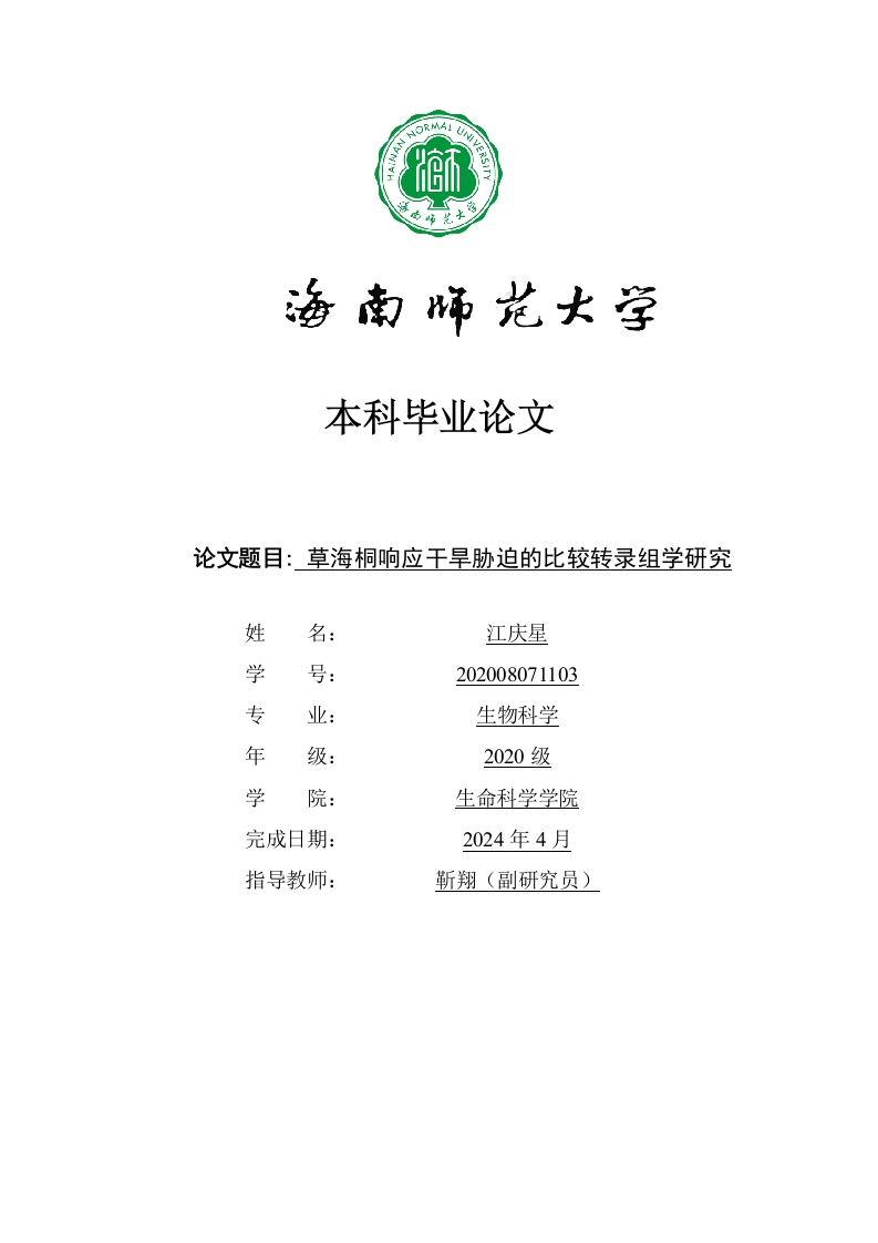 本科毕业论文论文题目:草海桐响应干旱胁迫的比较转录组学研究姓名:江庆星学号:202008071103专业:生物科学年级:2020级学生命科学学院完成日期:2024年4月指导教师:靳翔(副研究员)本科生毕业论文独创性声明本人声明所呈交的毕业论文是本人在导师指导下进行的研究工作及取得的研究成果,除了文中特别加以标注和致谢的地方外,本论文中没有抄袭他人研究成果和伪造数据等行为。与我一同工作的同志对本研究所做的任何贡献均已在论文中作了明确的说明并表示谢意。论文作者签名:日期:20年月日本科生毕业论文使用授权声明海南师范大学有权保留并向国家有关部门或机构送交毕业论文的复印件和磁盘,允许毕业论文被查阅和借阅。本人授权海南师范大学可以将本毕业论文的全部或部分内容编入有关数据库进行检索,可以采用影印、缩印或其他复印手段保存、汇编毕业论文。论文作者签名:日期:20年月日指导教师签名:日期:20年月日目录1引言…31.1草海桐概述和研究现状1.1.1草海桐概述1.1.2草海桐国内外研究1.2干旱胁迫对植物的影响.41.3转录组测序在植物研究中的应用.51.4本研究的意义和目的62实验材料与方法62.2实验方法..72.2.1草海桐生理指标测定2.2.2 LncRNA测序文库准备3实验结果与分析.83.1不同干旱胁迫下草海桐的表型差异83.2不同干旱胁迫下草海桐的生长指标测定3.3草海桐干旱胁迫的转录组学分析….123.3.1测序数据质量评估.123.3.2转录组数据定量分析..133.3.3差异表达基因分析.143.3.4预测IncRNA和蛋白质编码基因的共表达20.225结论和展望.….24参考文献I