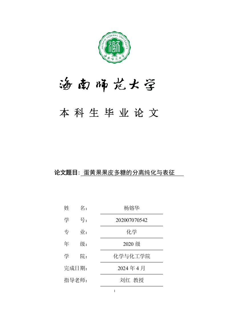 本科生毕业论文论文题目:蛋黄果果皮多糖的分离纯化与表征姓名:杨镕华学号:202007070542专化学年级:2020级学院:化学与化工学院完成日期:2024年4月指导老师:刘红教授本科生毕业论文(设计)独创性声明本人声明所呈交的毕业论文(设计)是本人在导师指导下进行的研究工作及取得的研究成果,除了文中特别加以标注和致谢的地方外,本论文中没有抄袭他人研究成果和伪造数据等行为。与我一同工作的同志对本研究所做的任何贡献均已在论文中作了明确的说明并表示谢意。论文作者签名:日期:20年月日本科生毕业论文(设计)使用授权声明海南师范大学有权保留并向国家有关部门或机构送交毕业论文(设计)的复印件和磁盘,允许毕业论文(设计)被查阅和借阅。本人授权海南师范大学可以将本毕业论文(设计)的全部或部分内容编入有关数据库进行检索,可以采用影印、缩印或其他复印手段保存、汇编毕业论文(设计)。论文作者签名:日期:20年月指导教师签名:日期:20年月日蛋黄果果皮多糖的分离纯化与表征作者:杨镕华指导教师:刘红教授(海南师范大学化学与化工学院,海口,571158)摘要:蛋黄果是一种稀有的热带或亚热带水果,果皮多糖含量丰富,其生物活性有待研究开发和利用。利用植物乳杆菌发酵蛋黄果果皮并对其多糖进行提取、分离纯化、结构表征和生物活性研究。从蛋黄果果皮植物乳杆菌发酵液中添加乙醇,再用三氯乙酸去除蛋白质后得到粗多糖,粗多糖经过DEAE-52纤维素柱和Sephadex G-75葡聚糖凝胶柱分离纯化得到多糖PCEP-1l,其状态为白色粉末,易溶于水,为非淀粉多糖。紫外光谱显示PCEP11纯化效果较好,红外光谱数据表明PCEP-l1为a-糖苷键类型。PCEP11和粗多糖对DPPH、ABTS、OH自由基均有清除能力,且抑制a-葡萄糖苷酶的IC0值分别为410233、7297.03gmL,关键词:蛋黄果果皮多糖;分离纯化;结构表征;生物活性Separation,purification and characterization of the peel ofPouteria campechianaAuthor:Ronghua Yang Tutor:Associate:Hong Liu(College of Chemistry and Chemical Engineering,Hainan Normal University,Haikou,571158)Abstract:Pouteria campechiana is a rare tropical or subtropical fruit with rich polysaccharide contentin the peel,and its biological activity needs to be developed and utilized.The extraction,separation,purification,structural characterization and biological activity of polysaccharide from the peel of Pouteriacampechiana were studied by using Lactobacillus plantarum.Polysaccharide PCEP-11 was obtained byDEAE-52 cellulose column and Sephadex G-75 glucan gel column.The polysaccharide was whitepowder,soluble in water,and non-starch polysaccharide.The UV spectra showed that PCEP-11 had agood purification effect,and the IR spectra showed that PCEP-11 was an a-glucoside bond type.PCEP-11and crude polysaccharide had scavenging ability on DPPH,ABTS and OH free radicals,and the IC sovalues of inhibiting a-glucosidase were 4102.33 and 7297.03 ug/mL,respectively.Key words:Polysaccharide from Pouteria campechiana peel;Separation and purification;Structuralcharacterization;Biological activity