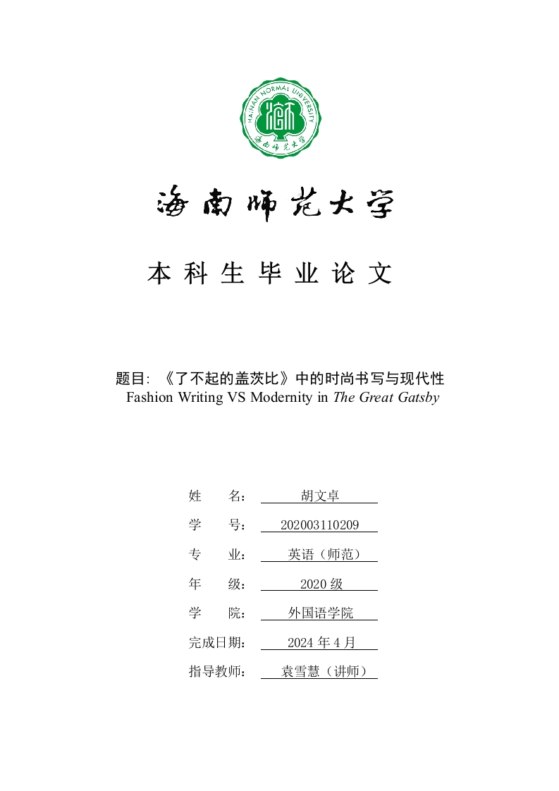 本科生毕业论文题目:《了不起的盖茨比》中的时尚书写与现代性Fashion Writing VS Modernity in The Great Gatsby姓名:胡文卓学202003110209专英语(师范)年2020级学外国语学院完成日期:2024年4月指导教师:袁雪慧(讲师)Fashion Writing VS Modernityin The Great GatsbyA Thesis Submittedto Faculty of School of Foreign Languages,Hainan Normal Universityin Partial Fulfillment of the Requirementsfor the Degree of Bachelor of ArtsBy Hu WenzhuoSupervisor:Yuan Xuehui (Lecturer)April,2024本科生毕业论文独创性声明本人声明所呈交的毕业论文是本人在导师指导下进行的研究工作及取得的研究成果,除了文中特别加以标注和致谢的地方外,本论文中没有抄袭他人研究成果和伪造数据等行为。与我一同工作的同志对本研究所做的任何贡献均已在论文中作了明确的说明并表示谢意。论文作者签名:日期:2024年4月17日本科生毕业论文使用授权声明海南师范大学有权保留并向国家有关部门或机构送交毕业论文的复印件和磁盘,允许毕业论文被查阅和借阅。本人授权海南师范大学可以将本毕业论文的全部或部分内容编入有关数据库进行检索,可以采用影印、缩印或其他复印手段保存、汇编毕业论文。论文作者签名:日期:2024年4月17日指导教师签名:日期:2024年4月17日