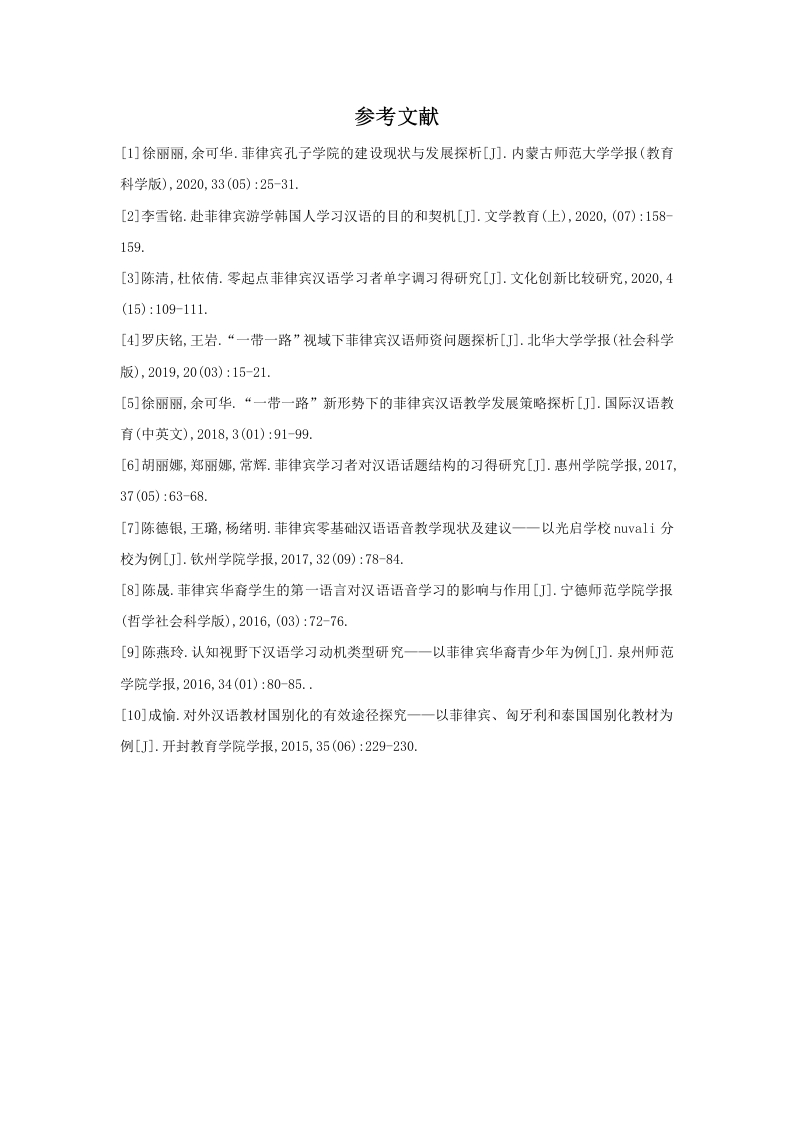 参考文献[1]徐丽丽,余可华.菲律宾孔子学院的建设现状与发展探析[J刀.内蒙古师范大学学报(教育科学版),2020,33(05):25-31.[2]李雪铭.赴菲律宾游学韩国人学习汉语的目的和契机[J刀.文学教育(上),2020,(07):158-159.[3]陈清,杜依倩.零起点菲律宾汉语学习者单字调习得研究[J刀.文化创新比较研究,2020,4(15):109-111.[4]罗庆铭,王岩.“一带一路”视域下菲律宾汉语师资问题探析[J刀.北华大学学报(社会科学版),2019,20(03):15-21.[5]徐丽丽,余可华.“一带一路”新形势下的菲律宾汉语教学发展策略探析[J刀.国际汉语教育(中英文),2018,3(01):91-99.[6]胡丽娜,郑丽娜,常辉.菲律宾学习者对汉语话题结构的习得研究[J刀.惠州学院学报,2017,37(05):63-68.[7]陈德银,王璐,杨绪明.菲律宾零基础汉语语音教学现状及建议一一以光启学校uvali分校为例[J].钦州学院学报,2017,32(09):78-84.[8]陈晟.菲律宾华裔学生的第一语言对汉语语音学习的影响与作用[J刀.宁德师范学院学报(哲学社会科学版),2016,(03):72-76.[9]陈燕玲.认知视野下汉语学习动机类型研究一一以菲律宾华裔青少年为例[J].泉州师范学院学报,2016,34(01):80-85.[10]成愉.对外汉语教材国别化的有效途径探究一一以菲律宾、匈牙利和泰国国别化教材为例[J].开封教育学院学报,2015,35(06):229-230.
