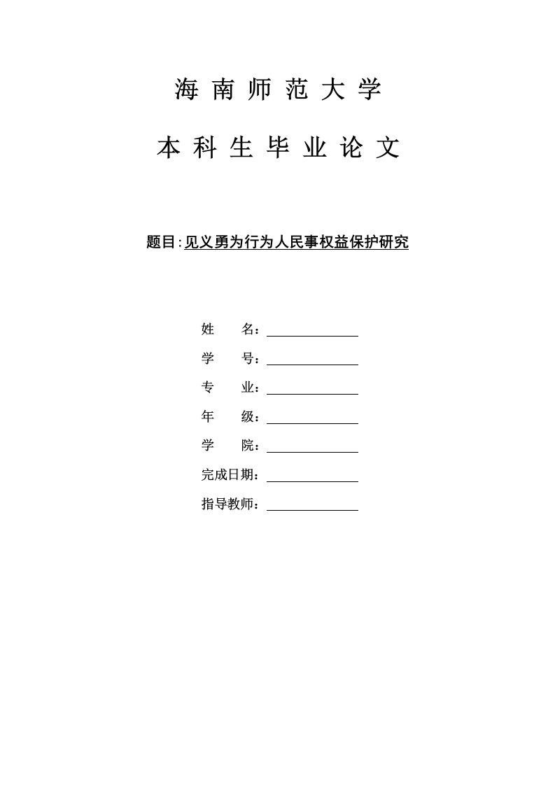 海南师范大学本科生毕业论文题目:见义勇为行为人民事权益保护研究姓名:学年级:学完成日期:指导教师:本科生毕业论文(设计)独创性声明本人声明所呈交的毕业论文(设计)是本人在导师指导下进行的研究工作及取得的研究成果,除了文中特别加以标注和致谢的地方外,本论文中没有抄袭他人研究成果和伪造数据等行为。与我一同工作的同志对本研究所做的任何贡献均已在论文中作了明确的说明并表示谢意。论文(设计)作者签名:日期:本科生毕业论文(设计)使用授权声明海南师范大学有权保留并向国家有关部门或机构送交毕业论文(设计)的复印件和磁盘,允许毕业论文(设计)被查阅和借阅。本人授权海南师范大学可以将本毕业论文(设计)的全部或部分内容编入有关数据库进行检索,可以采用影印、缩印或其他复印手段保存、汇编毕业论文(设计)。论文(设计)作者签名:日期:指导教师签名:日期:目录录摘要........................................Abstract....一、见义勇为者民法保护概述1.见义勇为行为的概念2.见义勇为的法律特征2(二)见义勇为者民法保护必要性3二、见义勇为行为人权益保护的法律适用困境4(一)见义勇为认定规则模糊…4(二)受益人范围不明确6(三)补偿标准和范围不明确.6(四)配套制度不完善.…三、对我国见义勇为者民法保护的完善建议(一)明确见义勇为认定规则(二)合理确定受益人范围9(三)健全补偿机制…1.具体界定受益人的范围和顺序2.明确补偿的标准和范围(四)完普相关配套制度13参考文献: