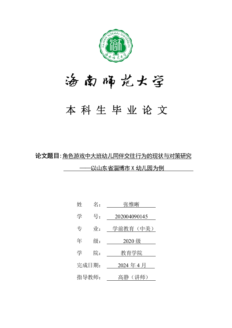 本科生毕业论文论文题目:角色游戏中大班幼儿同伴交往行为的现状与对策研究一以山东省淄博市X幼儿园为例姓名:张准晰学号:202004090145专学前教育(中美)年级:2020级学院:教育学院完成日期:2024年4月指导教师:高静(讲师)本科生毕业论文独创性声明本人声明所呈交的毕业论文是本人在导师指导下进行的研究工作及取得的研究成果,除了文中特别加以标注和致谢的地方外,本论文中没有抄袭他人研究成果和伪造数据等行为。与我一同工作的同志对本研究所做的任何贡献均已在论文中作了明确的说明并表示谢意。论文作者签名:日期:20年月日本科生毕业论文使用授权声明海南师范大学有权保留并向国家有关部门或机构送交毕业论文的复印件和磁盘,允许毕业论文被查阅和借阅。本人授权海南师范大学可以将本毕业论文的全部或部分内容编入有关数据库进行检索,可以采用影印、缩印或其他复印手段保存、汇编毕业论文。论文作者签名:日期:20年月日指导教师签名:日期:20年月日目录2.角色游戏对促进幼儿同伴交往行为的发展的重要性....13.当前角色游戏中大班幼儿同伴交往行为现状.....11.角色游戏22.同伴交往行为...(三)研究意义...21.理论意义..2.实践意义.(四)研究现状.1.国内研究现状.2.国外研究现状..二、角色游戏中大班幼儿同伴交往行为的现状和问题.....5(二)调查对象.(四)角色游戏中大班幼儿同伴交往行为的现状...........6