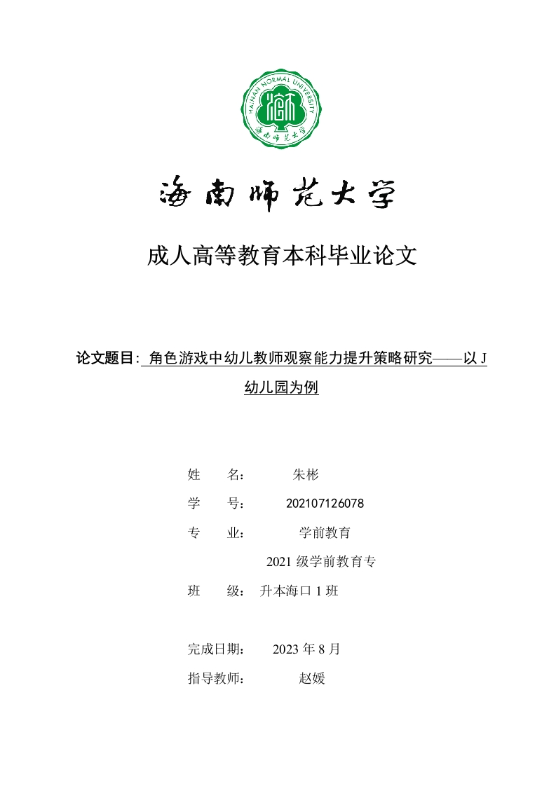 成人高等教育本科毕业论文论文题目:角色游戏中幼儿教师观察能力提升策略研究一以J幼儿园为例姓名:朱彬学号:202107126078专业:学前教育2021级学前教育专班级:升本海口1班完成日期:2023年8月指导教师:赵媛本科生毕业论文独创性声明本人声明所呈交的毕业论文是本人在导师指导下进行的研究工作及取得的研究成果,除了文中特别加以标注和致谢的地方外,本论文中没有抄袭他人研究成果和伪造数据等行为。与我一同工作的同志对本研究所做的任何贡献均已在论文中作了明确的说明并表示谢意。论文作者签名:朱彬日期:2023年8月31日本科生毕业论文使用授权声明海南师范大学有权保留并向国家有关部门或机构送交毕业论文的复印件和磁盘,允许毕业论文被查阅和借阅。本人授权海南师范大学可以将本毕业论文的全部或部分内容编入有关数据库进行检索,可以采用影印、缩印或其他复印手段保存、汇编毕业论文。论文作者签名:朱彬日期:2023年8月31日指导教师签名:日期:20年月日目录(一)研究背景与意义…21.研究背景22.研究意义…(二)文献综述1.国内研究综述22.国外研究综述3(三)研究目的与内容1.研究目的…2.研究内容…(四)研究方法…1.文献法42.问卷调查法…3.观察法4二、角色游戏中幼儿教师观察能力现状及问题分析(一)角色游戏中幼儿教师观察能力现状分析1.角色游戏中幼儿教师观察意识52.角色游戏中幼儿教师观察内容.63.角色游戏中幼儿教师观察方法4.角色游戏中幼儿教师观察结果9