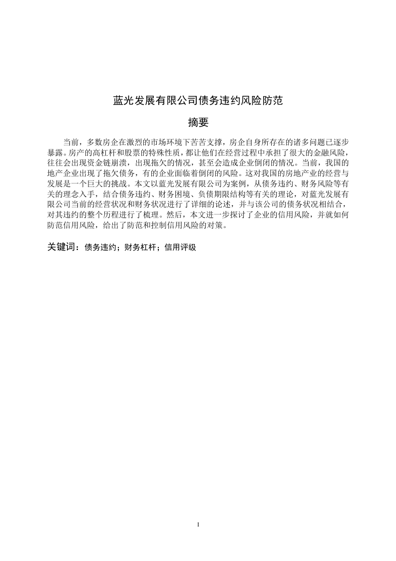 蓝光发展有限公司债务违约风险防范摘要当前,多数房企在激烈的市场环境下苦苦支撑,房企自身所存在的诸多问题已逐步暴露。房产的高杠杆和股票的特殊性质,都让他们在经营过程中承担了很大的金融风险,往往会出现资金链崩溃,出现拖欠的情况,甚至会造成企业倒闭的情况。当前,我国的地产企业出现了拖欠债务,有的企业面临着倒闭的风险。这对我国的房地产业的经营与发展是一个巨大的挑战。本文以蓝光发展有限公司为案例,从债务违约、财务风险等有关的理念入手,结合债务违约、财务困境、负债期限结构等有关的理论,对蓝光发展有限公司当前的经营状况和财务状况进行了详细的论述,并与该公司的债务状况相结合,对其违约的整个历程进行了梳理。然后,本文进一步探讨了企业的信用风险,并就如何防范信用风险,给出了防范和控制信用风险的对策。关键词:债务违约;财务杠杆;信用评级目录毕业论文原创性声明·....................II(一)研究目的与研究意义(二)研究内容与研究方法二、债务违约风险相关理论基础.…1三、蓝光发展有限公司债务违约及原因分析34(四)蓝光发展有限公司债务违约风险的原因分析4四、蓝光发展有限公司债务违约风险的防范措施.···5(一)加强公司治理避免董监高频繁变动.6(二防止企业因应实际情况而过分获取土地和进行过多的投入..6一、绪论(一)研究目的与研究意义1、研究目的随着时间的推移,在新冠病毒的冲击下,房地产业面临着越来越多的风险。这使得一直背负着“房住不炒”政策的地产行业陷入困境。在面临各种风险的情况下,房地产公司要采取“高周转”的规模化运营策略,保持现金流,降低负债,稳健发展。目前,我国的房地产业面临着诸多问题,如降息和信贷紧缩等,在某种意义上限制了我国房地产业的发展。本文从企业经营、发展状况等角度,对企业违约的原因进行了较为深刻的剖析。并结合当前我国的实际情况,给出了几点建议,希望能为企业的发展提供一定的参考。同时,也为其他面临类似问题的公司提供了参考。2、研究意义目前,房地产行业已成为国民经济中重要的支柱行业之一,而房地产行业的过度发展必然会对整个国家的经济增长造成负面的冲击。当然,这也必然会对人们的日常生活造成一些冲击。当前,我国的地产企业出现了拖欠债务,有的企业面临着倒闭的风险。这对我国的房地产业的经营与发展是一个巨大的挑战。所以,在这种情况下,企业面临着怎样应对这种政策可能产生的风险。从多个方面,对违约产生的本质成因进行剖析,并给出相关的应对措施,从而促使企业摆脱债务困境,这对于防止企业债务违约,促进债券市场的良性发展具有重要的意义。(二)研究内容与研究方法1、研究内容本文的主要工作有以下五个方面:第一章介绍了本课题的选题背景,本课题的研究目的和意义,研究方法与研究的基本内涵,并对国内外相关研究进行了简要回顾。第二章介绍了我国企业债券违约的一般含义,并对其进行了分析。第三章简要介绍了我国蓝光集团的概况,并对其发生的过程和产生的根源进行了剖析。第四章探讨了公司债券违约的相关对策。第四部分是本论文的总结。2、调查方式本文在进行这一调查的时候,使用了案例分析法、文献查阅法以及比较分析法。案例分析法指的是,本文将蓝光发展有限公司作为调查对象,从中发现了其在运营中所面临的一些违约风险问题,并给出了一些相关的对策,最后得到了一个研究结果。文献检索法指的是以研究内容为依据,对国内外及海外有关债务违约风险预防的文献资料展开了深入的分析与分析,对其进行了全面的解读与梳理,并对其进行了归纳与总结,从而让自己的论文的撰写与撰写变得更加清晰,更加清晰地表达自己的论文思想,同时也将自己的论文的创作方向给确定下来。比较分析法指的是用比较的方法,从水平和垂直两个方面,或是在最近几年的资料中,对造成债务违约的深层次的因素进行了剖析,从而找到了一些应对的方法与措施,让公司可以更好地避免这些问题的发生。二、债务违约风险相关理论基础