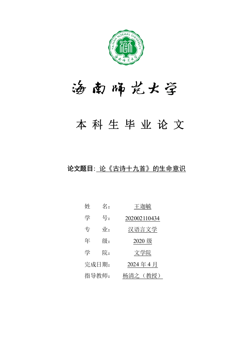 本科生毕业论文论文题目:论《古诗十九首》的生命意识姓名:王迦毓学号:202002110434专业:汉语言文学年级:2020级学院:文学院完成日期:2024年4月指导教师:杨清之(教授)本科生毕业论文独创性声明本人声明所呈交的毕业论文是本人在导师指导下进行的研究工作及取得的研究成果,除了文中特别加以标注和致谢的地方外,本论文中没有抄袭他人研究成果和伪造数据等行为。与我一同工作的同志对本研究所做的任何贡献均已在论文中作了明确的说明并表示谢意。论文作者签名:日期:20年月日本科生毕业论文使用授权声明海南师范大学有权保留并向国家有关部门或机构送交毕业论文的复印件和磁盘,允许毕业论文被查阅和借阅。本人授权海南师范大学可以将本毕业论文的全部或部分内容编入有关数据库进行检索,可以采用影印、缩印或其他复印手段保存、汇编毕业论文。论文作者签名:日期:20年月日指导教师签名:日期:20年月日目录一、生命意识的内涵…6(三)游子思妇的真情8(四)及时行乐的态度.·11三、《古诗十九首》生命意识的成因...(一)汉末社会背景对生命意识的影响.·13(二)文化传统中的生命观念.14结语…18