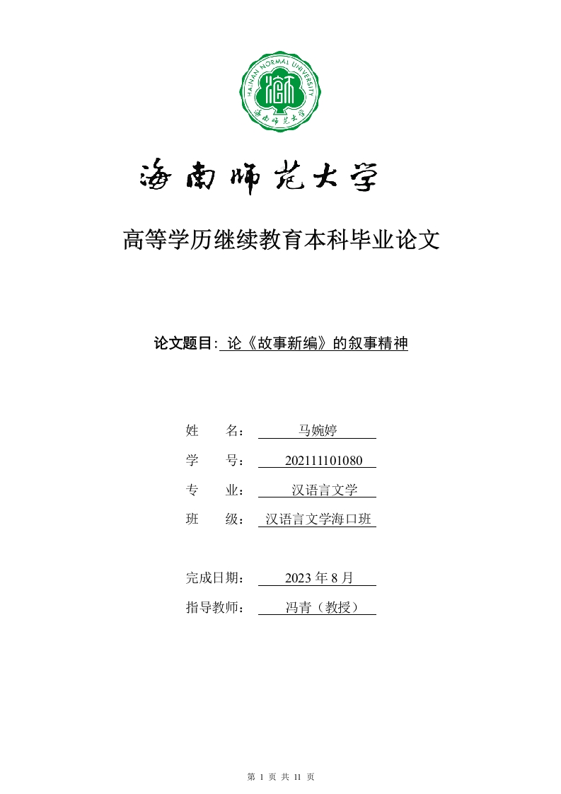 高等学历继续教育本科毕业论文论文题目:论《故事新编》的叙事精神姓名:马婉婷学号:202111101080专业:汉语言文学班级:汉语言文学海口班完成日期:2023年8月指导教师:冯青(教授)本科生毕业论文独创性声明本人声明所呈交的毕业论文是本人在导师指导下进行的研究工作及取得的研究成果,除了文中特别加以标注和致谢的地方外,本论文中没有抄袭他人研究成果和伪造数据等行为。与我一同工作的同志对本研究所做的任何贡献均已在论文中作了明确的说明并表示谢意。论文作者签名:马婉婷日期:2023年8月14日本科生毕业论文使用授权声明海南师范大学有权保留并向国家有关部门或机构送交毕业论文的复印件和磁盘,允许毕业论文被查阅和借阅。本人授权海南师范大学可以将本毕业论文的全部或部分内容编入有关数据库进行检索,可以采用影印、缩印或其他复印手段保存、汇编毕业论文。论文作者签名:马婉婷日期:2023年8月14日指导教师签名:日期:20目录1.】人物形象的世俗化.51.2故事情节的世俗化…1.3作品文风的世俗化.…62油滑叙事…62.1英雄严肃形象的消解72.2语言戏仿2.3情节的以古讽今3叙事特色的意义和价值83.1思想性83.2艺术性10