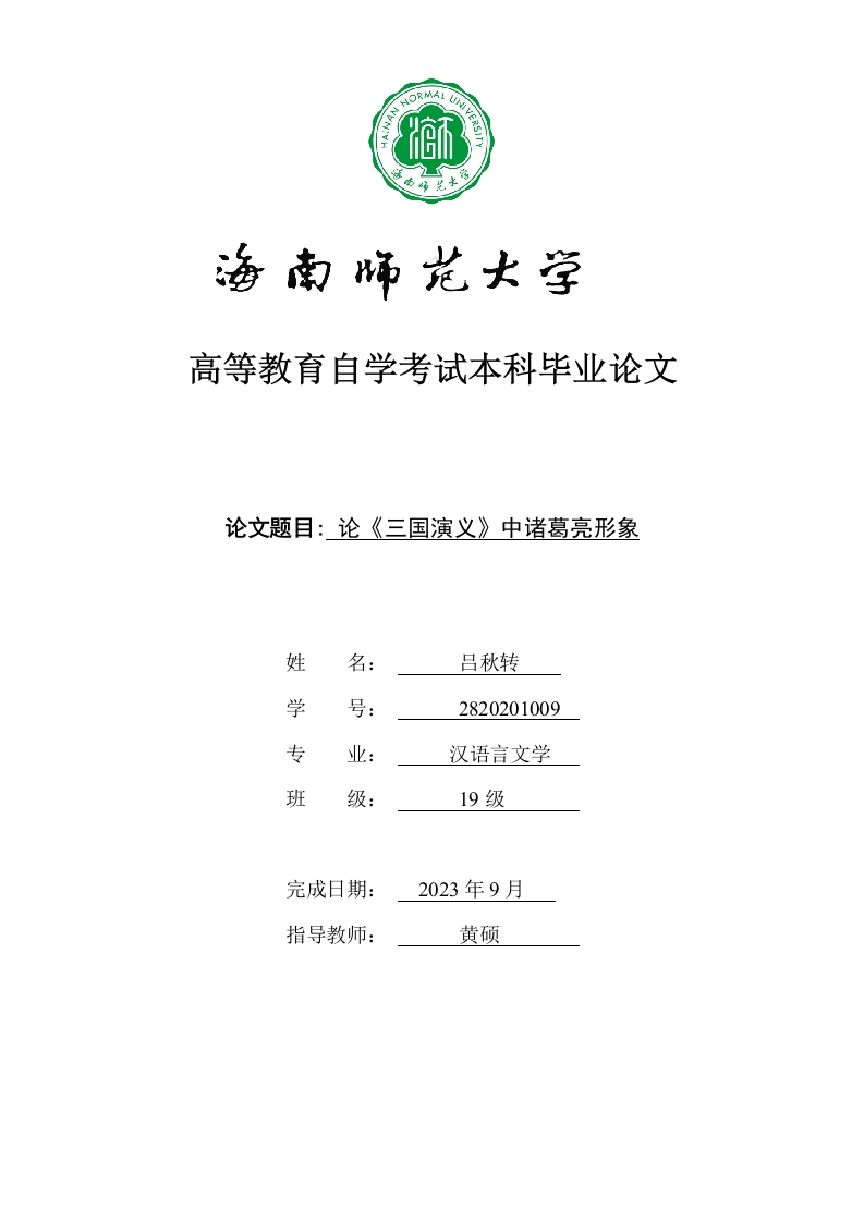高等教育自学考试本科毕业论文论文题目:论《三国演义》中诸葛亮形象姓名:吕秋转学号:2820201009专业:汉语言文学班级:19级完成日期:2023年9月指导教师:黄硕本科生毕业论文独创性声明本人声明所呈交的毕业论文是本人在导师指导下进行的研究工作及取得的研究成果,除了文中特别加以标注和致谢的地方外,本论文中没有抄袭他人研究成果和伪造数据等行为。与我一同工作的同志对本研究所做的任何贡献均已在论文中作了明确的说明并表示谢意。论文作者签名:吕秋转日期:2023年9月1日本科生毕业论文使用授权声明海南师范大学有权保留并向国家有关部门或机构送交毕业论文的复印件和磁盘,允许毕业论文被查阅和借阅。本人授权海南师范大学可以将本毕业论文的全部或部分内容编入有关数据库进行检索,可以采用影印、缩印或其他复印手段保存、汇编毕业论文。论文作者签名:吕秋转日期:2023年9月1日指导教师签名:日期:20年月日目录22三、诸葛亮的忠君为国..4(一)诸葛亮淡薄名利,不争权夺利.·69参考文献.911