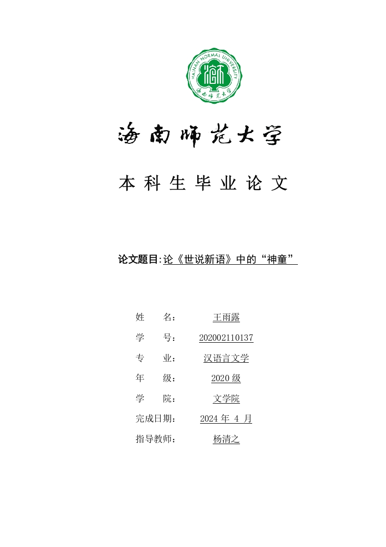 本科生毕业论文论文题目:论《世说新语》中的“神童”姓名:王雨露学号:202002110137专汉语言文学年级:2020级学院:文学院完成日期:2024年4月指导教师:杨清之本科生毕业论文独创性声明本人声明所呈交的毕业论文是本人在导师指导下进行的研究工作及取得的研究成果,除了文中特别加以标注和致谢的地方外,本论文中没有抄袭他人研究成果和伪造数据等行为。与我一同工作的同志对本研究所做的任何贡献均已在论文中作了明确的说明并表示谢意。论文作者签名:王雨露日期:2024年4月14日本科生毕业论文使用授权声明海南师范大学有权保留并向国家有关部门或机构送交毕业论文的复印件和磁盘,允许毕业论文被查阅和借阅。本人授权海南师范大学可以将本毕业论文的全部或部分内容编入有关数据库进行检索,可以采用影印、缩印或其他复印手段保存、汇编毕业论文。论文作者签名:王雨露日期:2024年4月14日指导教师签名:日期:20年月日目录一、魏晋时期的“神童”早慧特征1(一)熟用玄理、机敏过人…(二)品德方正、从容不迫…(三)外貌出众、气质非凡.3二、“神童”的最终命运…(一)命途多舛、慧极必伤、甚者死于非命.…4(二)碌碌庸庸、泯然众人5(三)能力出众、德不配位…(四)无愧“神童”之名.7三、魏晋士人对神童的态度8(一)夸大“神童”的存在,本质是社会上对名士的追捧8(二)纵容“神童”的不断涌现,寄托着成人世界的诉求…9四、对魏晋“神童”现象的反思11参考文献….15致谢