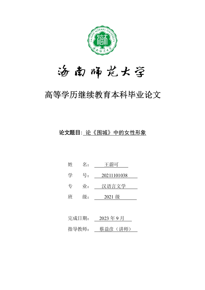 高等学历继续教育本科毕业论文论文题目:论《围城》中的女性形象姓名:王蔚可学号:20211101038专业:汉语言文学班级:2021级完成日期:2023年9月指导教师:蔡益彦(讲师)本科生毕业论文独创性声明本人声明所呈交的毕业论文是本人在导师指导下进行的研究工作及取得的研究成果,除了文中特别加以标注和致谢的地方外,本论文中没有抄袭他人研究成果和伪造数据等行为。与我一同工作的同志对本研究所做的任何贡献均已在论文中作了明确的说明并表示谢意。论文作者签名:王蔚可日期:2023年9月10日本科生毕业论文使用授权声明海南师范大学有权保留并向国家有关部门或机构送交毕业论文的复印件和磁盘,允许毕业论文被查阅和借阅。本人授权海南师范大学可以将本毕业论文的全部或部分内容编入有关数据库进行检索,可以采用影印、缩印或其他复印手段保存、汇编毕业论文。论文作者签名:王蔚可日期:2023年9月10日指导教师签名:日期:20年月日目录一、(二)、被困“围城”.1二、《围城》女性形象个性分析....2(一)、冷傲才女苏文纨..3三、文本女性名字暗含女性解放失败是必然的宿命...6四、女性解放失败的社会根源...8六、结语…9参考文献…