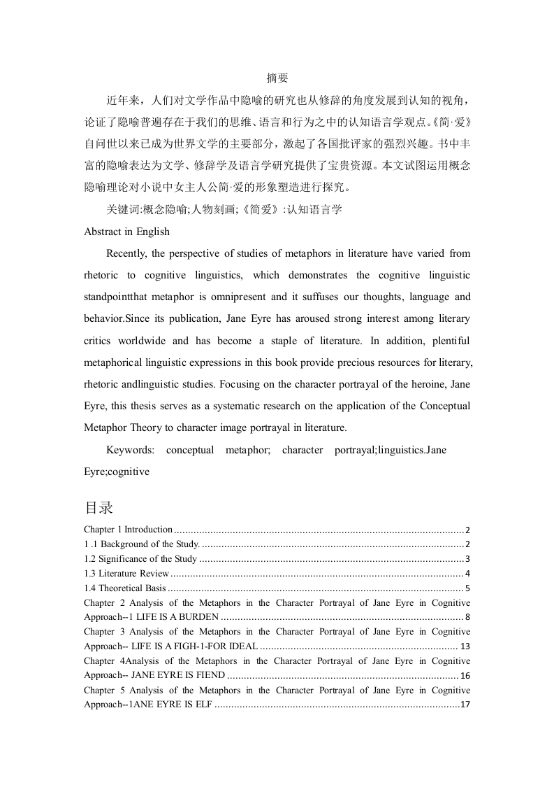 摘要近年来,人们对文学作品中隐喻的研究也从修辞的角度发展到认知的视角,论证了隐喻普遍存在于我们的思维、语言和行为之中的认知语言学观点。《简·爱》自问世以来已成为世界文学的主要部分,激起了各国批评家的强烈兴趣。书中丰富的隐喻表达为文学、修辞学及语言学研究提供了宝贵资源。本文试图运用概念隐喻理论对小说中女主人公简·爱的形象塑造进行探究。关键词:概念隐喻;人物刻画;《简爱》:认知语言学Abstract in EnglishRecently,the perspective of studies of metaphors in literature have varied fromrhetoric to cognitive linguistics,which demonstrates the cognitive linguisticstandpointthat metaphor is omnipresent and it suffuses our thoughts,language andbehavior.Since its publication,Jane Eyre has aroused strong interest among literarycritics worldwide and has become a staple of literature.In addition,plentifulmetaphorical linguistic expressions in this book provide precious resources for literary,rhetoric andlinguistic studies.Focusing on the character portrayal of the heroine,JaneEyre,this thesis serves as a systematic research on the application of the ConceptualMetaphor Theory to character image portrayal in literature.Keywords:conceptual metaphor;character portrayal;linguistics.JaneEyre;cognitive目录Chapter 1 Introduction.21.2 Significance of the Study....3Chapter 2 Analysis of the Metaphors in the Character Portrayal of Jane Eyre in CognitiveApproach--1 LIFE ISABURDEN....8Chapter 3 Analysis of the Metaphors in the Character Portrayal of Jane Eyre in CognitiveApproach--LIFE IS AFIGH-1-FOR IDEAL....13Chapter 4Analysis of the Metaphors in the Character Portrayal of Jane Eyre in CognitiveChapter 5 Analysis of the Metaphors in the Character Portrayal of Jane Eyre in CognitiveApproach--1ANE EYRE IS ELF.17Chapter 6Conclusions ...............Chapter 1 Introduction1.1 Background of the Study.For over 2,000 years,metaphor was studied within the discipline known asrhetoric.Aristotle once said,"the greatest thing by far is to be a master of metaphor.Itis the onething that cannot be learned from others.It is the hallmark of genius"(WangYin,2007:403).Far from being merely a matter of figure of speech,metaphor is amatter of thought.Human language and conceptual system are fundamentallymetaphorical in nature.Intheir most influential book Metaphors We Live By,Lakoffand Johnson claim that theessence of metaphor is understanding and experiencing onekind of thing in terms ofanother.This book is the landmark in the study of metaphorfrom the cognitiveperspective.Numerous scholars,such as Mark Johnson,Mark Turner,ZoltanKovecses,GillesFauconnier,Elena Semino,Raymond Gibbs have madegreatcontribution to the development of cognitive metaphor theory.They demonstratethatmetaphor is fundamentally not a rhetorical device,but a cognitive process,whichinfluences human understanding of the world and plays a vital role in theformation ofhuman categorization,conceptual structure and reasoning.Recently,thestudies ofmetaphors from the cognitive perspective have attached great importance tothe languageexpressions of literary works,and scholars have varied their researchmethod fromrhetoric to cognitive linguistics.The language expressions in the literaryworks provideabundant resources for the development of cognitive metaphorsJane Eyre was written by Charlotte 13ronte in the early Victorian period and wasfirstpublished in I $47.It is her most successful work and has remained the mostpopular ofher books.Since its f rst appearance,Jane Eyre's passionate voice offirst-person heroinetook the Victorian literature world by storm,and Charlotte's talentwas almost universally acclaimed.Charlotte Bronte has a good command ofvocabulary,and flexibly use of the Bibleallusions.Meanwhile,poeticlanguageanddifferentsentencepatternsto portray characters are the distinctive features of Jane Eyre.Thenumerous metaphorical linguisticexpressions in the book are rich resources for literary,rhetoric and linguisticstudies.Inspired by the achievements in cognitive linguistics,the author of the presentstudyattempts to analyze the metaphors used in the character portrayal of Jane Eyre inthe novel from the cognitive perspective.1.2 Significance of the StudyThe significance of the study mainly includes:First,Jane Eyre is generally acknowledged as an autobiographical novel ofCharlotte Bronte,and the development of the novel is mostly based on her lifeexperiences;by theanalysis of the relationship between the Charlotte Bronte and JaneEyre in Jane Eyre,thisthesis will testify the feasibility of three claims of the embodiedphilosophy in theanalysis of literary work,and facilitate readers'understanding of thisnovel from thecognitive perspective.second,with the close examination of conceptual metaphors in the novel,thisthesiswill elaborate on the contribution of this cognitive tool to the portrayal of thecharacterimage.if successful,it will provide a new way for the study of charactercreation in literature.1.3 Literature ReviewOver the last thirty years,the influence of Cognitive Metaphor Theory (CMT)hasshifted attention to patterns of conventional metaphorical expressions in