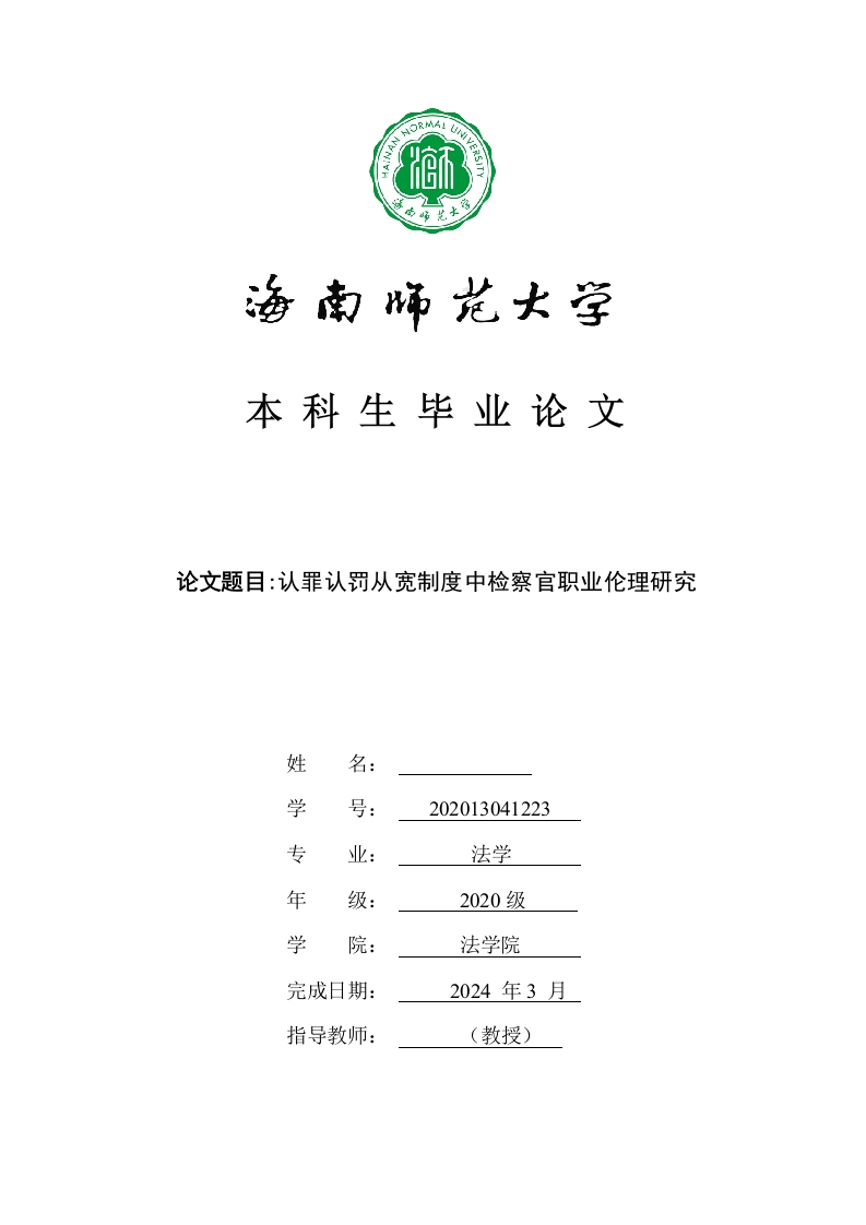本科生毕业论文论文题目:认罪认罚从宽制度中检察官职业伦理研究姓名:学号:202013041223专法学年级:2020级学院:法学院完成日期:2024年3月指导教师:(教授)本科生毕业论文独创性声明本人声明所呈交的毕业论文是本人在导师指导下进行的研究工作及取得的研究成果,除了文中特别加以标注和致谢的地方外,本论文中没有抄袭他人研究成果和伪造数据等行为。与我一同工作的同志对本研究所做的任何贡献均已在论文中作了明确的说明并表示谢意。论文作者签名:日期:20年月日本科生毕业论文使用授权声明海南师范大学有权保留并向国家有关部门或机构送交毕业论文的复印件和磁盘,允许毕业论文被查阅和借阅。本人授权海南师范大学可以将本毕业论文的全部或部分内容编入有关数据库进行检索,可以采用影印、缩印或其他复印手段保存、汇编毕业论文。论文作者签名:日期:20年月日指导教师签名:日期:20年月日目录引言…(二)轻罪快处案件分流...3(一)尊重案件事实...(三)保障被追诉人权利..6三、认罪认罚从宽制度中检察官的职业伦理检视..69(一)被追诉人自愿性保障不足.….6(二)检察官自由裁量权使用不当.…7四、认罪认罚从宽制度中检察官的职业伦理规范完善..9-12(一)充分保障被追诉人权利...9(二)依法约束检察官的自由裁量权...10(五)坚持廉洁奉公.....参考文献.