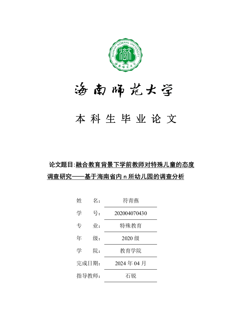 本科生毕业论文论文题目:融合教育背景下学前教师对特殊儿童的态度调查研究一基于海南省内n所幼儿园的调查分析姓名:符青燕学号:202004070430专业:特殊教育年级:2020级学院:教育学院完成日期:2024年04月指导教师:石锐本科生毕业论文独创性声明本人声明所呈交的毕业论文是本人在导师指导下进行的研究工作及取得的研究成果,除了文中特别加以标注和致谢的地方外,本论文中没有抄袭他人研究成果和伪造数据等行为。与我一同工作的同志对本研究所做的任何贡献均已在论文中作了明确的说明并表示谢意。论文作者签名:日期:2024年月日本科生毕业论文使用授权声明海南师范大学有权保留并向国家有关部门或机构送交毕业论文的复印件和磁盘,允许毕业论文被查阅和借阅。本人授权海南师范大学可以将本毕业论文的全部或部分内容编入有关数据库进行检索,可以采用影印、缩印或其他复印手段保存、汇编毕业论文。论文作者签名:日期:2024年月日指导教师签名:日期:2024年月日融合教育背景下学前教师对特殊儿童的态度调查研究基于海南省内n所幼儿园的调查分析作者:符青燕指导教师:石锐(海南师范大学教育学院,海口,571158)摘要:本文通过对海南省内所幼儿园进行调查,以80名学前教师为研究对象,使用调查问卷和访谈探究他们对特殊儿童的了解程度、对特殊儿童入园入班的接纳程度以及对学前融合的参与意愿。同时揭示了在海南开展学前融合面对的难题,如师资缺乏、经费问题、设备问题等。本研究旨在通过学前教师对特殊儿童的态度调查进行,并提出改善态度的策略,为海南学前融合的开展提供帮助。A survey on the attitudes of preschool teachers towardsspecial needs children under the background of integratededucation:based on a survey and analysis of nkindergartens in Hainan ProvinceAuthor:Qingyan Fu Advisor:Shi RuiAbstract:This article conducts a survey on n kindergartens in Hainan Province,with80 preschool teachers as the research subjects.The survey questionnaire andinterviews are used to explore their understanding of special needs children,theiracceptance of special needs children entering kindergarten and classes,and theirwillingness to participate in preschool integration.At the same time,it reveals thedifficulties faced by promoting preschool integration in Hainan,such as a lack ofteaching staff,funding issues,equipment problems,etc.The aim of this study is toinvestigate the attitudes of preschool teachers towards special needs children andpropose strategies to improve their attitudes,in order to provide assistance for thedevelopment of preschool integration in Hainan.Keywords:integrated education;Preschool teachers;attitude