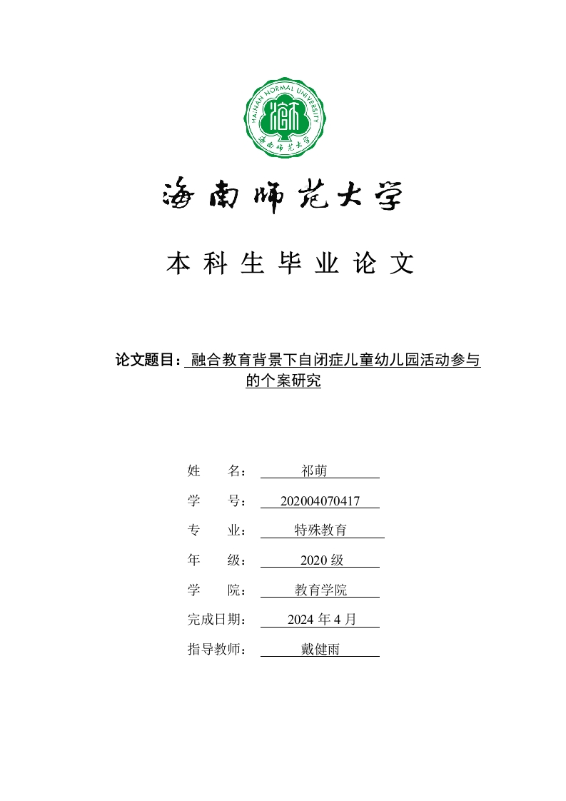 本科生毕业论文论文题目:融合教育背景下自闭症儿童幼儿园活动参与的个案研究姓名:祁萌学202004070417专业:特殊教育年2020级学院:教育学院完成日期:2024年4月指导教师:戴健雨本科生毕业论文独创性声明本人声明所呈交的毕业论文是本人在导师指导下进行的研究工作及取得的研究成果,除了文中特别加以标注和致谢的地方外,本论文中没有抄袭他人研究成果和伪造数据等行为。与我一同工作的同志对本研究所做的任何贡献均已在论文中作了明确的说明并表示谢意。论文作者签名:日期:2024年月日本科生毕业论文使用授权声明海南师范大学有权保留并向国家有关部门或机构送交毕业论文的复印件和磁盘,允许毕业论文被查阅和借阅。本人授权海南师范大学可以将本毕业论文的全部或部分内容编入有关数据库进行检索,可以采用影印、缩印或其他复印手段保存、汇编毕业论文。论文作者签名:日期:2024年月日指导教师签名:日期:2024年月日目录(一)研究背景.1.理论依据1(二)研究意义…21.理论意义22.实践意义…2(三)核心概念界定31.自闭症儿童32.融合教育.…33.幼儿园活动…44.活动参与…(四)文献综述51.自闭症儿童幼儿园活动参与现状的研究52.自闭症儿童幼儿园活动参与的意义研究.53.自闭症儿童活动参与影响因素的研究..64.促进自闭症儿童幼儿园活动参与的策略研究.75.研究述评…8二、研究设计…8(一)研究目的.…8(二)研究内容.(三)研究对象9(四)研究方法…1.观察法..102.访谈法3.问卷调查法…(五)研究创新点101.研究内容上的创新10
