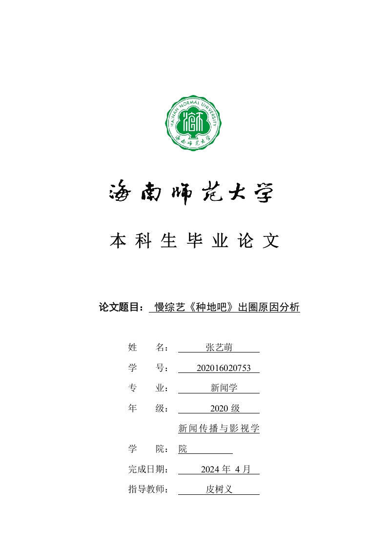 本科生毕业论文论文题目:慢综艺《种地吧》出圈原因分析姓张艺萌学号:202016020753专业:新闻学年级:2020级新闻传播与影视学学院完成日期:2024年4月指导教师:皮树义本科生毕业论文独创性声明本人声明所呈交的毕业论文是本人在导师指导下进行的研究工作及取得的研究成果,除了文中特别加以标注和致谢的地方外,本论文中没有抄袭他人研究成果和伪造数据等行为。与我一同工作的同志对本研究所做的任何贡献均已在论文中作了明确的说明并表示谢意。论文作者签名:日期:20年月日本科生毕业论文使用授权声明海南师范大学有权保留并向国家有关部门或机构送交毕业论文的复印件和磁盘,允许毕业论文被查阅和借阅。本人授权海南师范大学可以将本毕业论文的全部或部分内容编入有关数据库进行检索,可以采用影印、缩印或其他复印手段保存、汇编毕业论文。论文作者签名:日期:20年月日指导教师签名:日期:20年月日目录(一)研究背景(二)研究现状1.研究问题….2(四)研究方法及难点创新点.··1.研究方法22二《种地吧》综艺节目设计..(一)嘉宾选择31.常驻嘉宾选择4(二)嘉宾人设5(三)节目题材·5(四)节目场景选择.6(五)衍生综艺及IP打造7(六)节目不足之处7.8(二)内容为王910(四)观众参与.10四《种地吧》出圈价值意义.·1010(二)节目社会价值