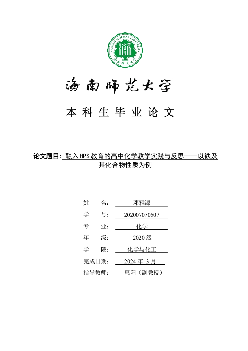 本科生毕业论文论文题目:融入HPS教育的高中化学教学实践与反思一以铁及其化合物性质为例姓名:邓雅源学号:202007070507专化学年2020级学院:化学与化工完成日期:2024年3月指导教师:惠阳(副教授)本科生毕业论文独创性声明本人声明所呈交的毕业论文是本人在导师指导下进行的研究工作及取得的研究成果,除了文中特别加以标注和致谢的地方外,本论文中没有抄袭他人研究成果和伪造数据等行为。与我一同工作的同志对本研究所做的任何贡献均已在论文中作了明确的说明并表示谢意。论文作者签名:日期:20年月日本科生毕业论文使用授权声明海南师范大学有权保留并向国家有关部门或机构送交毕业论文的复印件和磁盘,允许毕业论文被查阅和借阅。本人授权海南师范大学可以将本毕业论文的全部或部分内容编入有关数据库进行检索,可以采用影印、缩印或其他复印手段保存、汇编毕业论文。论文作者签名:日期:20年月日指导教师签名:日期:20年月日目录1引言1.2研究目的和意义…1.2.1研究目的.…1.2.2研究意义1.3研究内容和方法.21.3.1研究内容…21.3.2研究方法…22HPS基本介绍…2.1HPS教育内涵..22.2研究现状.…2.2.1国外研究.…2.2.2国内研究现状42.3核心素养背景下的HPS.53HPS教育在高中化学教学中的渗透现状调查53.1调查目的…3.2学生问卷调查及分析…3.2.1学生问卷设计…3.2.2学生问卷结果分析3.3教师问卷调查及分析83.3.1教师问卷设计…3.3.2教师问卷结果分析94HPS教育在高中化学教学中的实践研究114.1基于HPS教育的教学设计.…114.2教学效果分析4.2.1问卷设计.…324.2.2结果分析…4.3研究结论…34