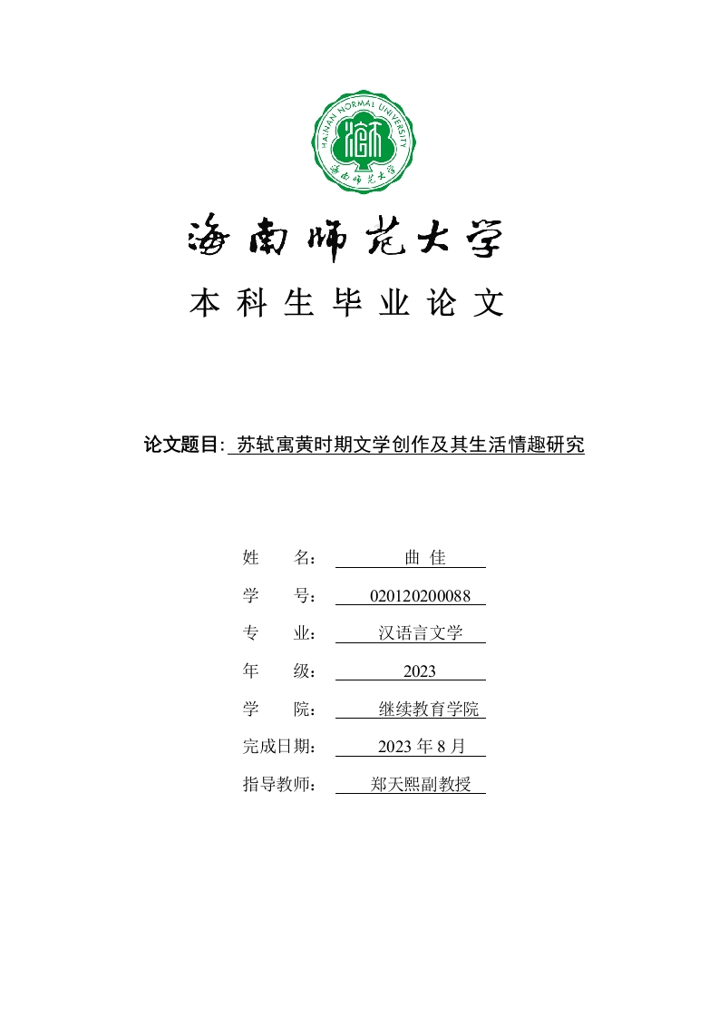 本科生毕业论文论文题目:苏轼寓黄时期文学创作及其生活情趣研究姓名:曲佳学号:020120200088专汉语言文学年2023学院:继续教育学院完成日期:2023年8月指导教师:郑天熙副教授目录1苏轼黄州时期的交游与生活1.1苏轼黄州时期的生活状态1.1.1初到黄州陌生疏离21.1.2一家团聚,躬耕东坡31.2与友人的交往1.2.1亲友不离不弃52苏轼在黄州时期的文学创作62.1苏轼黄州时期诗歌创作62.1.1这一时期诗风的转变62.1.2诗歌题材的“生活化”72.2苏轼黄州时期词的创作92.2.1这一时期词作内容风格的新变92.2.2影响词作风格新变的原因112.3苏轼黄州时期散文的创作122.3.1作品中的民本主义思想122.3.2寄情山水的旷达心态133结语15参考文献16致谢17苏轼寓黄时期文学创作及其生活情趣研究作者:曲佳指导教师:郑天熙摘要:苏轼寓黄时期的生活环境和交往人物的变化导致了他心境的转变。黄州成为苏轼的涅槃之地,也成就了他文学创作的高峰。苏轼在黄州时期的生活、交游、创作较之以往发生了明显的变化。本文从上述三个方面入手,探讨此时期苏轼的文学作品与生活情趣。生活的困窘迫使他凡率“亲力亲为”,相对闲适的生活节奏也让他有了纵情山水潜心禅宗佛道的“雅趣”。身体与心同时匍匐下去,精神得以超脱。这一时期的文学作品从质量上来看是苏轼创作史上的高峰。作品中的旷达情怀与民本主义思想影响了一代代的人。由此可见,无论是从文学角度来看还是立足于当下的社会来看,研究苏轼这一时期的生活、作品与其中墓含的情怀都是非常有价值的。The research about literary creation and delight of life whensushi in the HuangzhouAuthor:Jia Qu Tutor:Tianxi ZhengAbstract:The change of living environment and people in his relationship during the Yu Huang periodled to the change of his mood.Huangzhou became the nirvana of Sushi,and also achieved the peak of hisliterary creation.Su Shi's life,intercourse and creation in Huangzhou period have changed obviouslycompared with the past.Starting from the above three aspects,this paper probes into Su Shi's literaryworks and life interest in this period.The embarrassment of life forced him to "do things by himself",andthe relatively leisurely pace of life also gave him the "elegant interest"of indulging in mountains andrivers and concentrating on Zen Buddhism.The body and the heart crawl down at the same time,and thespirit can be detached.The literary works of this period are the peak of Su Shi's creation history in termsof quality.The broad feelings and people-oriented thoughts in the works have influenced generations ofpeople.Therefore,whether from the perspective of literature or based on the current society,it is veryvaluable to study Su Shi's life,works and feelings in this period.Key words:Su Shi;Huangzhou;Works;live1苏轼黄州时期的交游与生活苏轼被贬黄州后,生活上非常因困窘,与之交往的对象也从文人士大夫扩大到乡野农夫。丰富的人生经历让他的内心更加包容,远离政治漩涡也让他有机会在此慢慢沉淀。创作素材丰富了,作品更加多元,精神升华了,赋子了作品更加厚重的内涵。在