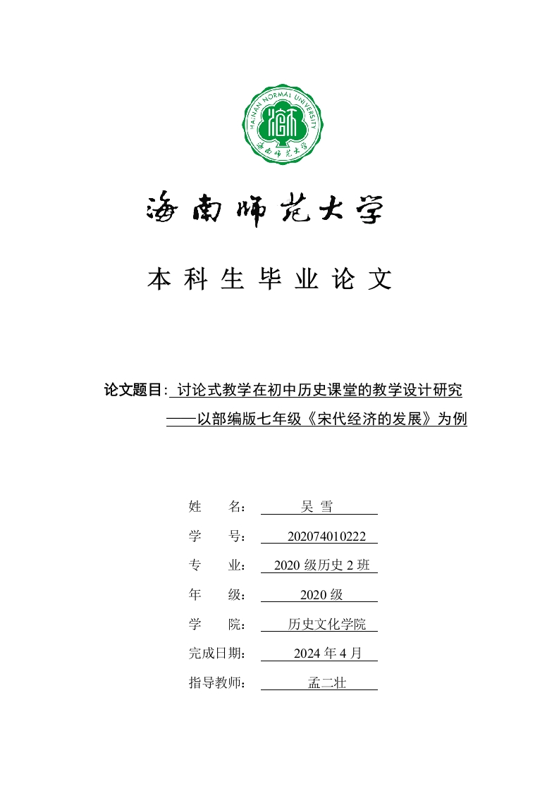 本科生毕业论文论文题目:讨论式教学在初中历史课堂的教学设计研究以部编版七年级《宋代经济的发展》为例姓名:吴雪学号:202074010222专2020级历史2班年2020级学院:历史文化学院完成日期:2024年4月指导教师:孟二壮本科生毕业论文独创性声明本人声明所呈交的毕业论文是本人在导师指导下进行的研究工作及取得的研究成果,除了文中特别加以标注和致谢的地方外,本论文中没有抄袭他人研究成果和伪造数据等行为。与我一同工作的同志对本研究所做的任何贡献均已在论文中作了明确的说明并表示谢意。论文作者签名:日期:20年月日本科生毕业论文使用授权声明海南师范大学有权保留并向国家有关部门或机构送交毕业论文的复印件和磁盘,允许毕业论文被查阅和借阅。本人授权海南师范大学可以将本毕业论文的全部或部分内容编入有关数据库进行检索,可以采用影印、缩印或其他复印手段保存、汇编毕业论文。论文作者签名:日期:20年月日指导教师签名:日期:20年月日目录1一、选题依据及研究意义1(二)研究意义二、国内外研究综述.。(一)关于“讨论式教学”国外研究综述…(二)关于“讨论式教学”国内研究综述…3三、拟研究的主要内容、创新点、重难点以及研究思路.。45(三)研究重难点(四)研究思路6第一章关于讨论式教学的概况7一、定义二、类型7三、特征…89(三)合作性9第二章讨论式教学法在初中历史教学中应用的理论基础.…10一、建构主义理论…10二、人本主义学习理论…10三、“学习金字塔”理论…10第三章“讨论式教学”在初中历史课堂的运用现状…一、调查方法一一学生调查问卷设计.。12二、调查结果分析一一学生问卷调查结果分析…13(一)学生对历史课比较有兴趣.。13(二)学生对讨论式教学法的喜爱程度较高..13(三)讨论式教学实施过程分析.…15三、讨论式教学运用到《宋代经济的发展》优点分析.·18第四章讨论式教学在初中历史课堂的教学设计研究...21以部编版七年级《宋代经济的发展》为例第一部分:准备阶段…第二部分:讨论阶段…24第三部分:总结阶段…33参考文献…3435附36