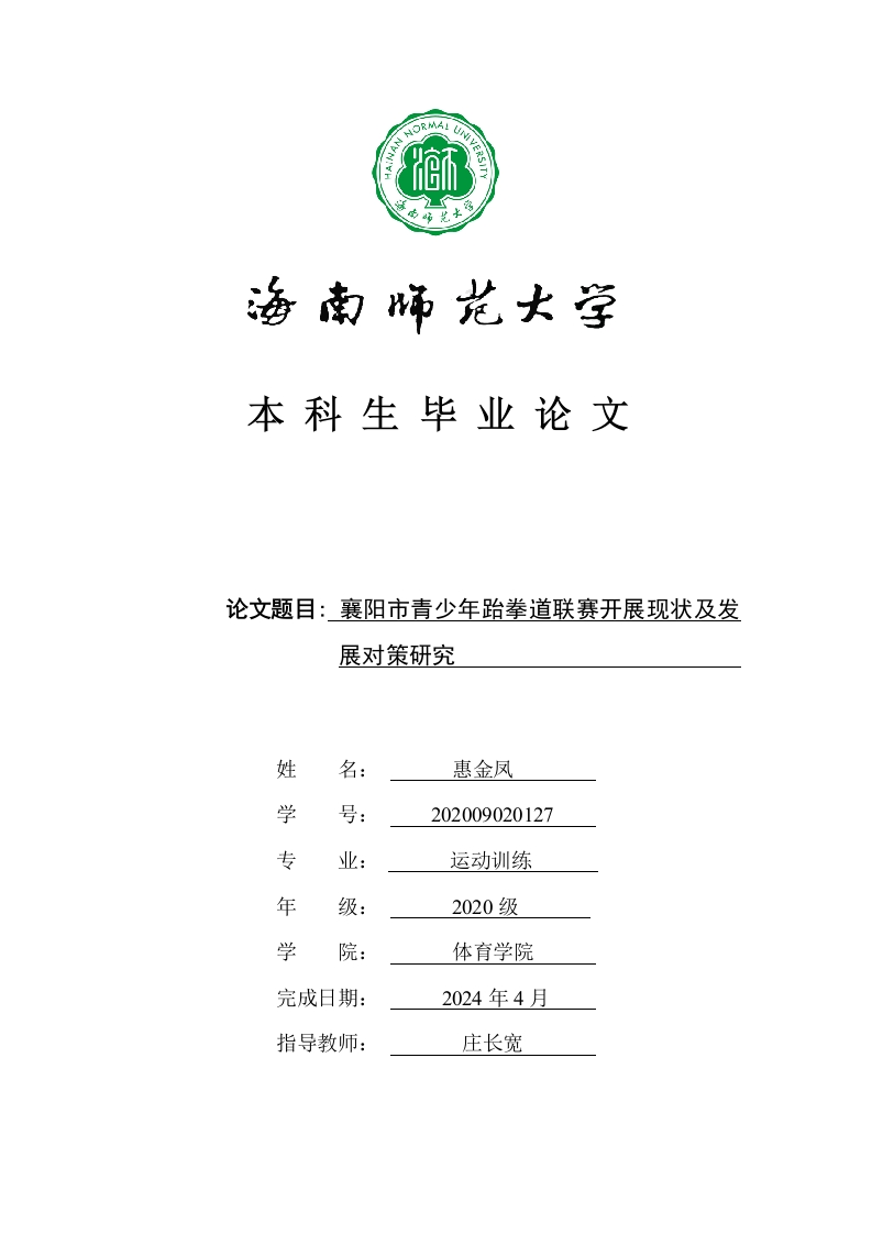 本科生毕业论文论文题目:襄阳市青少年跆拳道联赛开展现状及发展对策研究姓名:惠金凤学号:202009020127专运动训练年级:2020级学院:体育学院完成日期:2024年4月指导教师:庄长宽本科生毕业论文独创性声明本人声明所呈交的毕业论文是本人在导师指导下进行的研究工作及取得的研究成果,除了文中特别加以标注和致谢的地方外,本论文中没有抄袭他人研究成果和伪造数据等行为。与我一同工作的同志对本研究所做的任何贡献均已在论文中作了明确的说明并表示谢意。论文作者签名:日期:2024年月日本科生毕业论文使用授权声明海南师范大学有权保留并向国家有关部门或机构送交毕业论文的复印件和磁盘,允许毕业论文被查阅和借阅。本人授权海南师范大学可以将本毕业论文的全部或部分内容编入有关数据库进行检索,可以采用影印、缩印或其他复印手段保存、汇编毕业论文。论文作者签名:日期:2024年月日指导教师签名:日期:2024年月日目录1研究背景及意义...1.1研究背景...1.3文献综述...2研究对象与研究方法.·2.1研究对象....3332.2.2问卷调查法32.2.3实地考察法...32.2.4数理统计法..3.1襄阳市青少年跆拳道联赛的运动员基本情况调查.·...·43.2襄阳市青少年跆拳道联赛运动员参赛动机分析..·43.3襄阳市青少年跆拳道联赛的教练员调查分析.·..·53.4襄阳市青少年跆拳道联赛的赛事安排情况...…53.4.1比赛的时间、地点设置情况..·53.4.2比赛的参赛资格及报名途径调查分析..6..63.4.4比赛的安全保障情况调查...78
