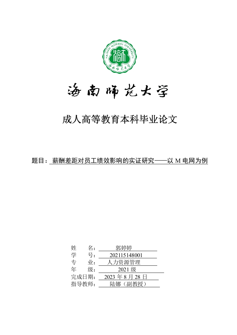 成人高等教育本科毕业论文题目:薪酬差距对员工绩效影响的实证研究一以M电网为例姓名:郭婷婷学号:202115148001专业:人力资源管理年2021级完成日期:2023年8月28日指导教师:陆娜(副教授)本科生毕业论文独创性声明本人声明所呈交的毕业论文是本人在导师指导下进行的研究工作及取得的研究成果,除了文中特别加以标注和致谢的地方外,本论文中没有抄袭他人研究成果和伪造数据等行为。与我一同工作的同志对本研究所做的任何贡献均已在论文中作了明确的说明并表示谢意。论文作者签名:日期:20年月日本科生毕业论文使用授权声明海南师范大学有权保留并向国家有关部门或机构送交毕业论文的复印件和磁盘,允许毕业论文被查阅和借阅。本人授权海南师范大学可以将本毕业论文的全部或部分内容编入有关数据库进行检索,可以采用影印、缩印或其他复印手段保存、汇编毕业论文。论文作者签名:日期:20年月日指导教师签名:日期:20年月日目录一.研究背景及意义2(一)研究背景2(二)研究意义…二.文献综述…3(一)薪酬与薪酬差距.3(二)薪酬差距与组织绩效三.M电网公司薪酬体系现状.(一)M电网公司组织机构及人员构成51.M电网公司组织机构情况.…2.M电网公司人员构成情况.6(二)M电网公司薪酬…1.M电网公司薪酬体系72.M电网公司薪酬差距.四.M电网公司组织绩效现状.…(一)M电网公司组织绩效分析.131M电网公司组织绩效考核体系.…2.M电网公司组织绩效…(二)M电网公司部门组织绩效151.M电网公司职能车间组织绩效152.M电网公司供电所组织绩效…(三)M电网公司组织绩效存在的问题…171.员工组织绩效及薪酬存在较大差距.2.薪酬与绩效不挂钩,降低了中层管理人员工资的关注度183.内部职能部门和车间的组织绩效差距过大五.M电网公司薪酬差距优化方案…(一)横向薪酬差距优化…1.组织绩效最优部门分配方案分析192.横向薪酬差距优化方案…213.横向薪酬差距优化方案实施保障…22(二)中层管理人员管理优化…221.实施健全中层管理人员的双向选拔机制222.优化直线经理的业绩考核制度223.实施中层管理人员管理优化方案23