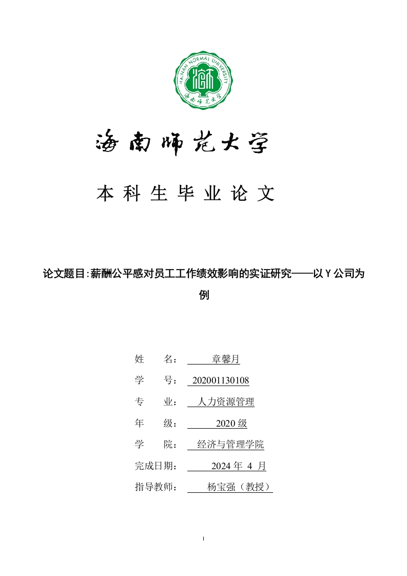 本科生毕业论文论文题目:薪酬公平感对员工工作绩效影响的实证研究一以Y公司为例姓名:章馨月学号:202001130108专人力资源管理年级:2020级学院:经济与管理学院完成日期:2024年4月指导教师:杨宝强(教授)本科生毕业论文独创性声明本人声明所呈交的毕业论文是本人在导师指导下进行的研究工作及取得的研究成果,除了文中特别加以标注和致谢的地方外,本论文中没有抄袭他人研究成果和伪造数据等行为。与我一同工作的同志对本研究所做的任何贡献均已在论文中作了明确的说明并表示谢意。论文作者签名:日期:2024年月日本科生毕业论文使用授权声明海南师范大学有权保留并向国家有关部门或机构送交毕业论文的复印件和磁盘,允许毕业论文被查阅和借阅。本人授权海南师范大学可以将本毕业论文的全部或部分内容编入有关数据库进行检索,可以采用影印、缩印或其他复印手段保存、汇编毕业论文。论文作者签名:日期:20年月日指导教师签名:日期:20年月日薪酬公平感对员工工作绩效影响的实证研究一以Y公司为例作者:章馨月指导教师:杨宝强教授(海南师范大学经济与管理学院,海口,571158)摘要:本研究旨在探讨薪酬公平感对员工工作绩效的影响,并以Y公司作为案例进行实证研究。本研究从理论和实践两个角度探讨了薪酬公平观念的重要性及其对员工绩效的影响。采用问卷调查和统计分析的方法,对Y公司的员工进行抽样调查,以了解他们对薪酬公平感的认知及其对工作绩效的影响。通过调查分析得出员工薪酬公平感与员工年龄、职位、婚姻状态、工作年限、学历和性别因素之间的关系并确定了薪酬公平感对员工绩效的影响。研究发现,薪酬公平感对员工工作绩效有显著的正向影向。结论指出,提高薪酬公平感有助于员工工作积极性和绩效水平的提升,从而推动组织整体发展。综上所述,本研究为探讨薪酬公平感对员工工作绩效的影响提供了实证支持,并为提升员工工作表现和企业绩效提供了有益的启示。关键词:薪酬公平感:绩效公平感:工作绩效