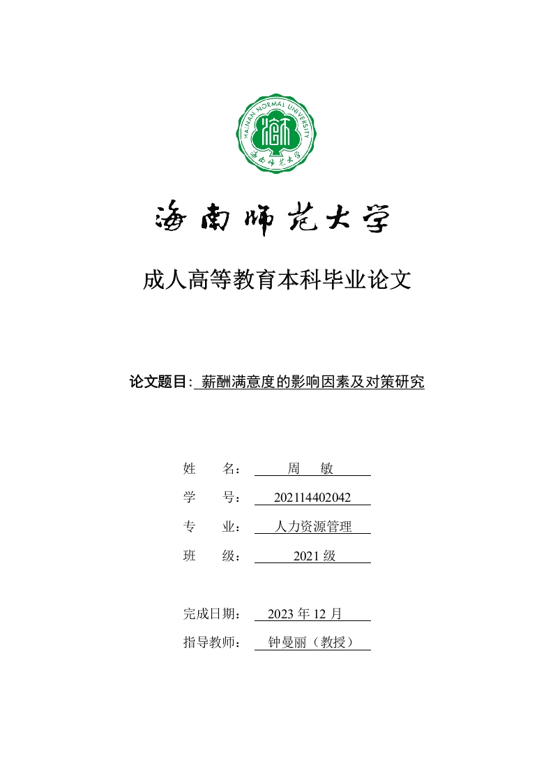 GAN成人高等教育本科毕业论文论文题目:薪酬满意度的影响因素及对策研究姓名:周敏学号:202114402042专业:人力资源管理班级:2021级完成日期:2023年12月指导教师:钟曼丽(教授)本科生毕业论文独创性声明本人声明所呈交的毕业论文是本人在导师指导下进行的研究工作及取得的研究成果,除了文中特别加以标注和致谢的地方外,本论文中没有抄袭他人研究成果和伪造数据等行为。与我一同工作的同志对本研究所做的任何贡献均已在论文中作了明确的说明并表示谢意。论文作者签名:周敏日期:2023年12月23日本科生毕业论文使用授权声明海南师范大学有权保留并向国家有关部门或机构送交毕业论文的复印件和磁盘,允许毕业论文被查阅和借阅。本人授权海南师范大学可以将本毕业论文的全部或部分内容编入有关数据库进行检索,可以采用影印、缩印或其他复印手段保存、汇编毕业论文。论文作者签名:周敏日期:2023年12月23日指导教师签名:日期:20年月日薪酬满意度的影响因素及对策研究作者:周敏指导教师:钟曼丽教授(海南师范大学继续教育学院,海口,571158)摘要:薪酬满意度在组织管理中具有重要意义,对员工的工作动机和绩效有重要影响。所以研究薪酬满意度的提升因素对于优化组织管理具有重要意义,但是这不是一种简单的事情,需要运用多种手段,并与制度相配合,为加强企业制度的建立、科学合理的企业薪酬制度,完善企业薪酬管理,完善企业文化建设,最大限度地提高员工满意度,本文从影响员工薪酬满意度的因素入手,分析员工薪酬满意度的重要性,并提出相关建议和意见。研究方法包括文献综述和实证研究,在文献综述中,通过对现有研究的梳理和总结,归纳整理出影响薪酬满意度的各类因素,包括薪酬水平、薪酬分配公平性、薪酬激励机制等,实证研究将收集相关数据,通过统计分析方法验证先前研究结果的有效性,并进一步探索其他可能的影响因素,研究结果对于组织管理者制定有效的薪酬策略和提升员工满意度具有重要意义。关键词:薪酬管理;满意度;影响因素Research on Influencing Factors and Countermeasuresof Salary SatisfactionAuthor:Min Zhou Tutor:Manli Zhong(School of Continuing Education,HaiNan Normal University,HaiKou,571158)Abstract:Salary satisfaction is of great significance in organizational management,which has asignificant impact on employees'work motivation and performance.Therefore,it is of great significance tostudy the promotion factors of salary satisfaction for optimizing organizational management,but it is not asimple matter,and it needs to use various means and cooperate with the system to strengthen theestablishment of enterprise system,establish a scientific and reasonable enterprise salary system,improveenterprise salary management and establish enterprise culture,and maximize employee satisfaction.Thispaper starts with the factors that affect employees'salary satisfaction,analyzes the importance ofemployees'salary satisfaction,and puts forward relevant opinions and suggestions.The research methodsinclude literature review and empirical research.In the literature review.through combing and summarizingthe existing research,various factors that affect employees'salary satisfaction are summarized,includingsalary level,fairness of salary distribution,salary incentive mechanism,etc.The empirical research willcollect relevant data.The validity of previous research results is verified by statistical analysis,and otherpossible influencing factors are further explored.The research results are of great significance fororganizational managers to formulate effective compensation strategies and improve employee satisfaction.Keyword:Salary Administration;Degree of satisfaction;Influencing factor