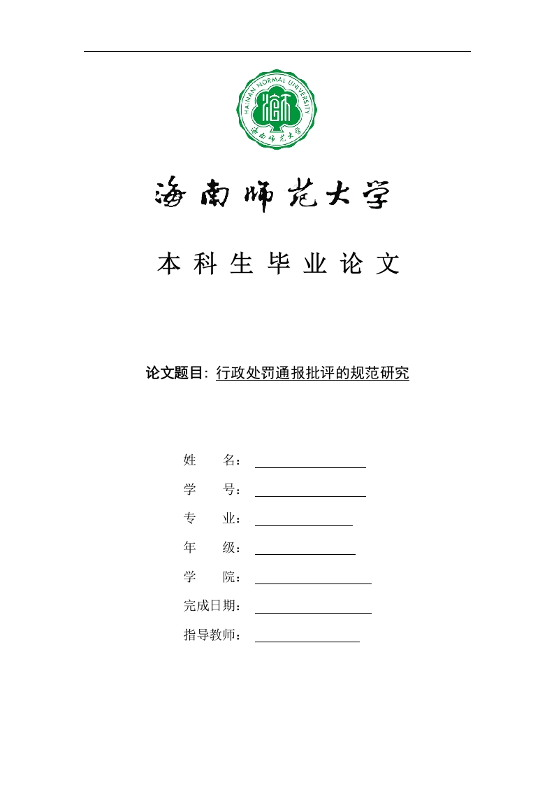 本科生毕业论文论文题目:行政处罚通报批评的规范研究姓名:学号:专业:年级:学完成日期:指导教师:本科生毕业论文(设计)独创性声明本人声明所呈交的毕业论文(设计)是本人在导师指导下进行的研究工作及取得的研究成果,除了文中特别加以标注和致谢的地方外,本论文中没有抄袭他人研究成果和伪造数据等行为。与我一同工作的同志对本研究所做的任何贡献均已在论文中作了明确的说明并表示谢意。论文(设计)作者签名:日期:本科生毕业论文(设计)使用授权声明海南师范大学有权保留并向国家有关部门或机构送交毕业论文(设计)的复印件和磁盘,允许毕业论文(设计)被查阅和借阅。本人授权海南师范大学可以将本毕业论文(设计)的全部或部分内容编入有关数据库进行检索,可以采用影印、缩印或其他复印手段保存、汇编毕业论文(设计)。论文(设计)作者签名:日期:指导教师签名:日期:目录摘要1Abstract........................................一、行政处罚“通报批评”的概述…1(一)行政处罚“通报批评”的概念.…1(二)行政处罚“通报批评”的不同表现形式2(三)行政处罚“通报批评”的特征.…3(四)行政处罚“通报批评”的规范意义二、行政处罚“通报批评”的规范现状441、行政处罚法2021年修订前..42、行政处罚法2021年修订后.4三、当前行政处罚“通报批评”存在的问题.7(一)立法规范模糊…7(二)行政处罚“通报批评”的通报途径和范围不清.…8(三)行政相对人的隐私信息缺乏保护8(四)缺乏完善的行政处罚“通报批评”程序9四、完善行政处罚“通报批评”的建议9(一)完善行政处罚“通报批评”的立法空白91、严格规范行政处罚“通报批评”的处罚方式92、科学规定行政处罚“通报批评”的处罚范围3、明确规定行政处罚“通报批评”的内容.10(二)完善行政处罚“通报批评”的执行程序1、引入事前听证程序…2、构建事后救济渠道11结语…12参考文献…
